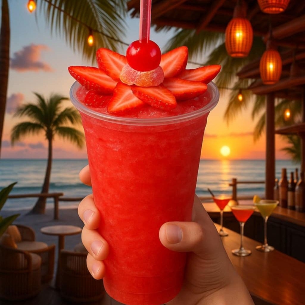 Vaso de 1lt , fresas , 4 oz ron , fresada dulce y natural.