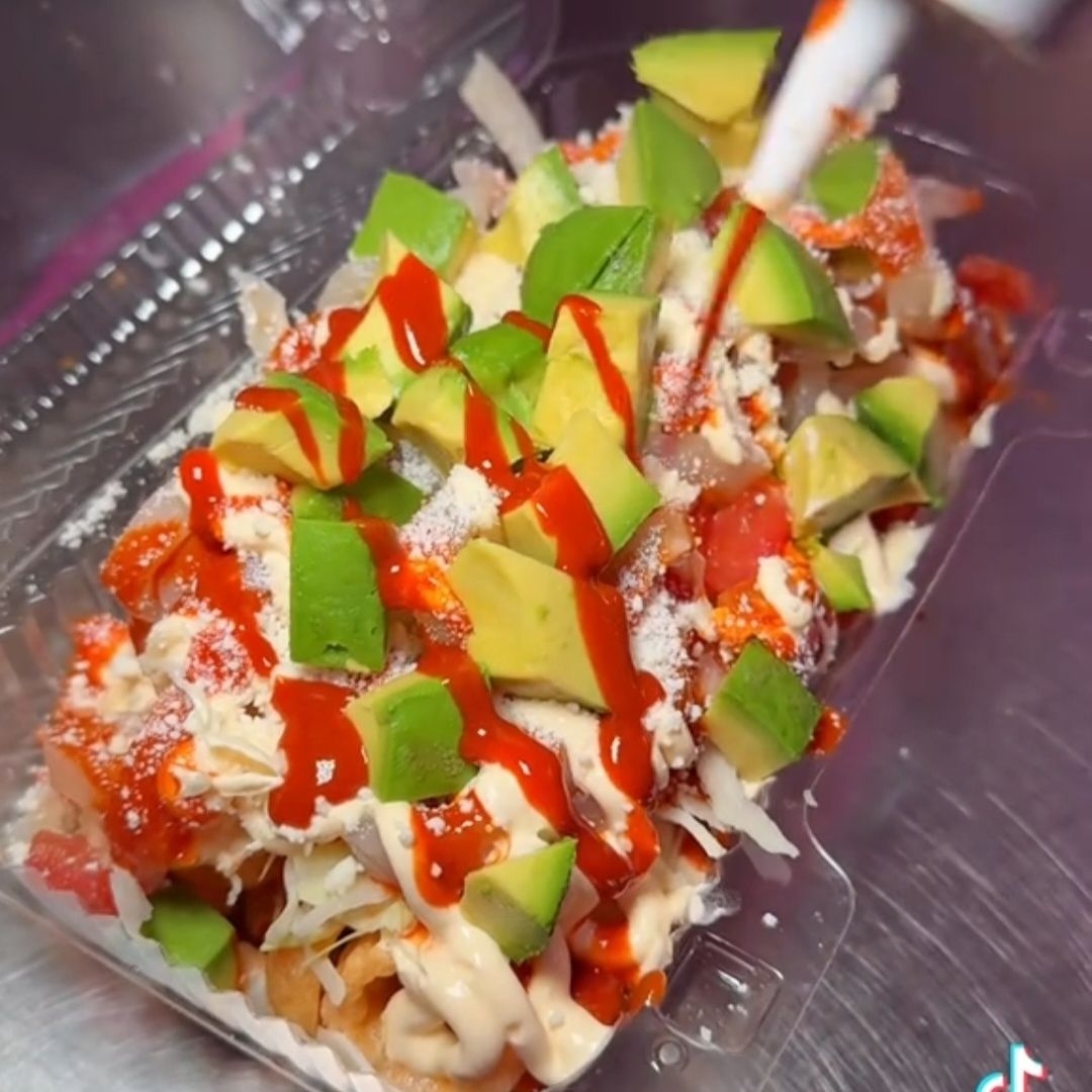 Vaso de 1 lt con papas fritas, pepino,churritos,cacahuetes y cueritos bañado en salsa cubana, chamoy y botonera