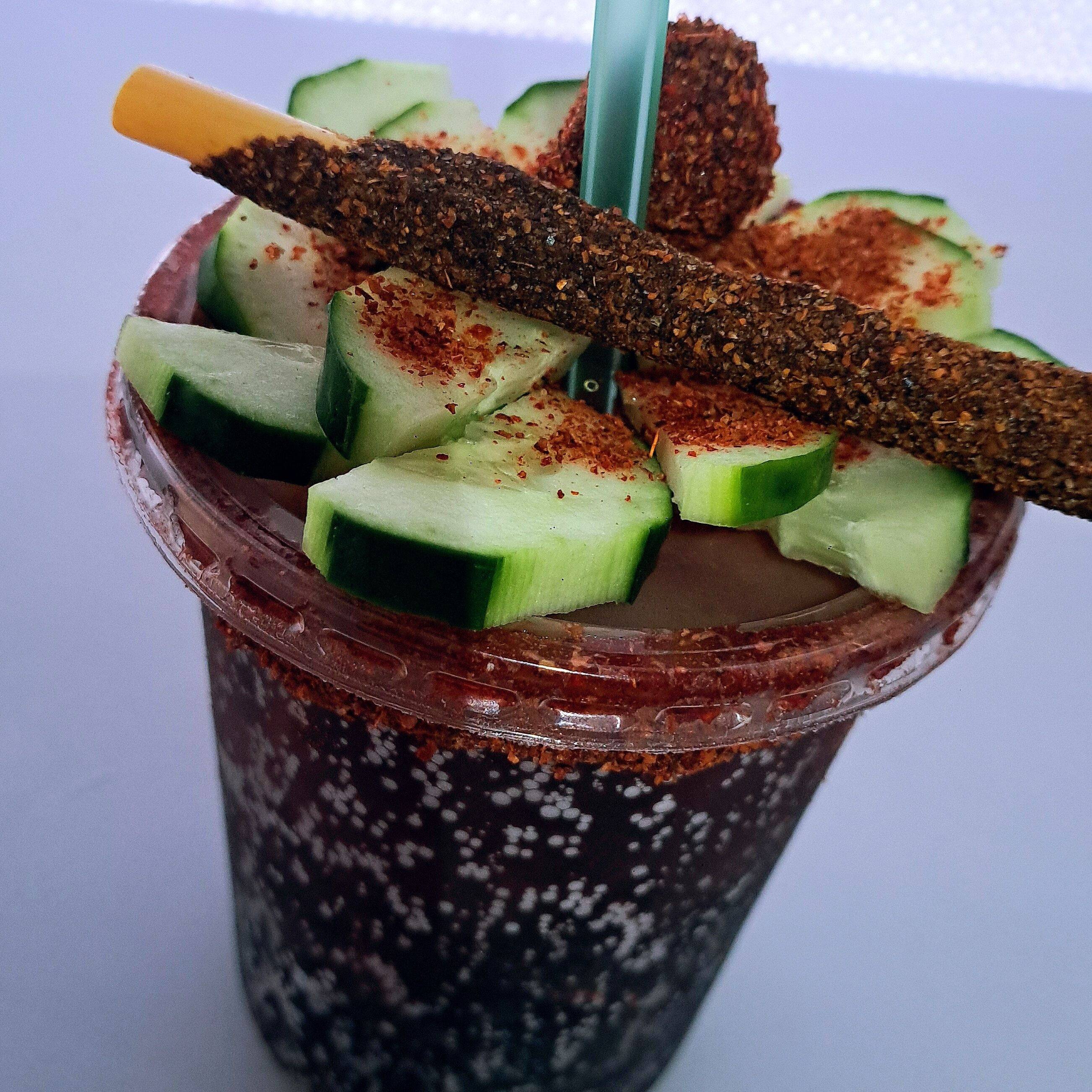 Vaso de 1lt sal , limon , hielo, tajin escarchado picosito , topping de pepino con uñgomita de mango picosita🤤