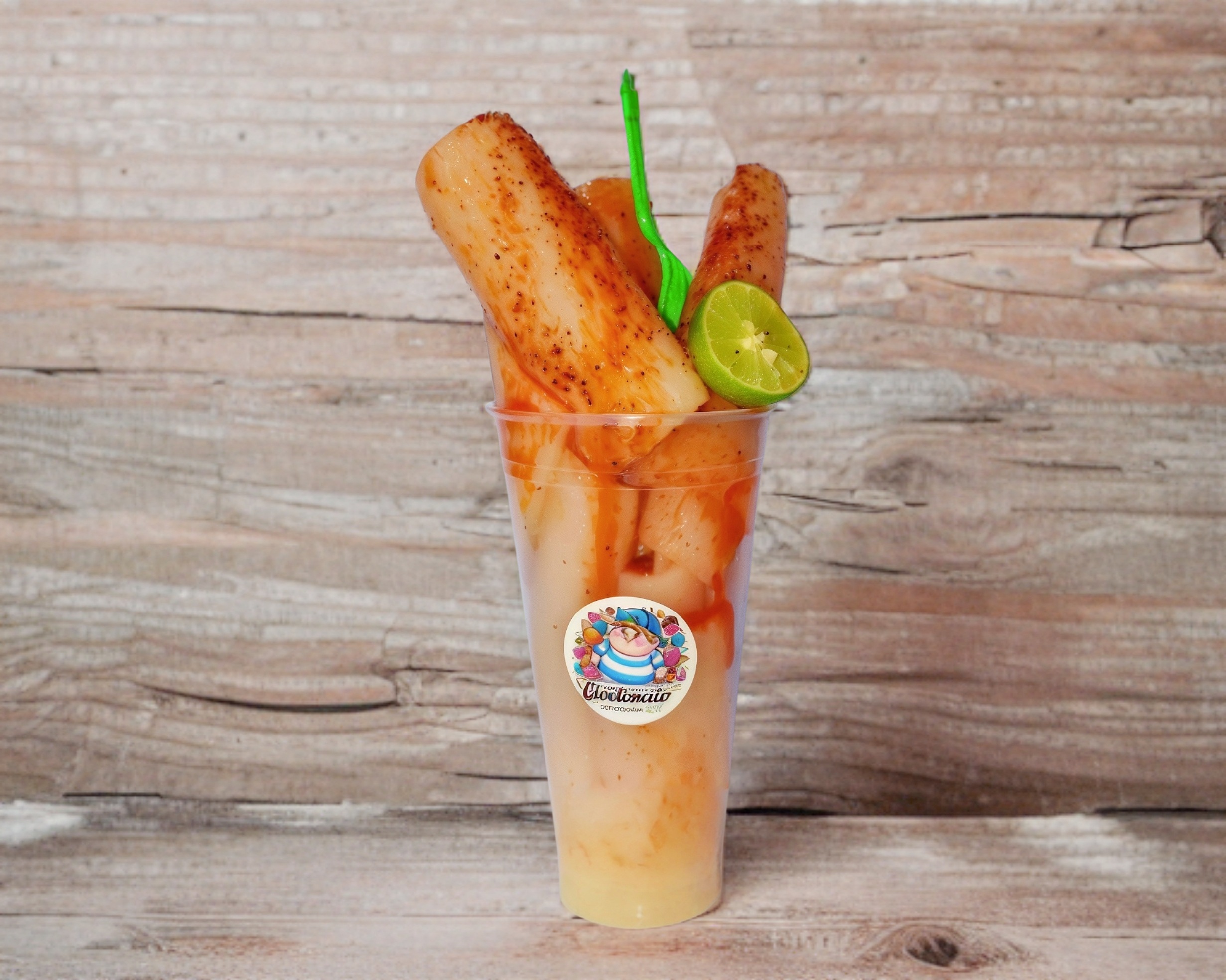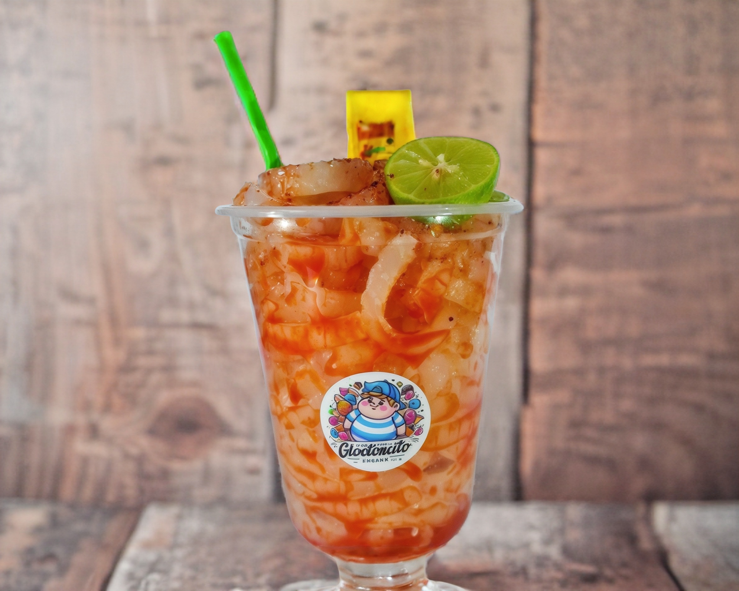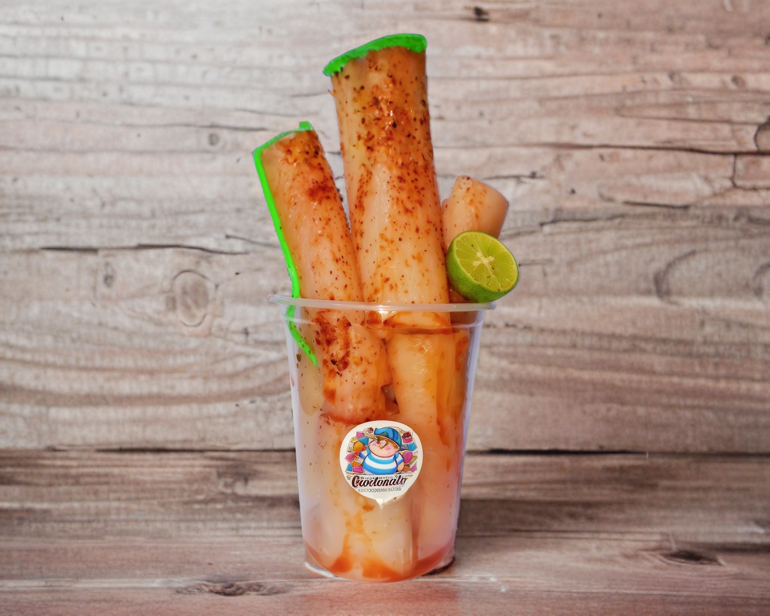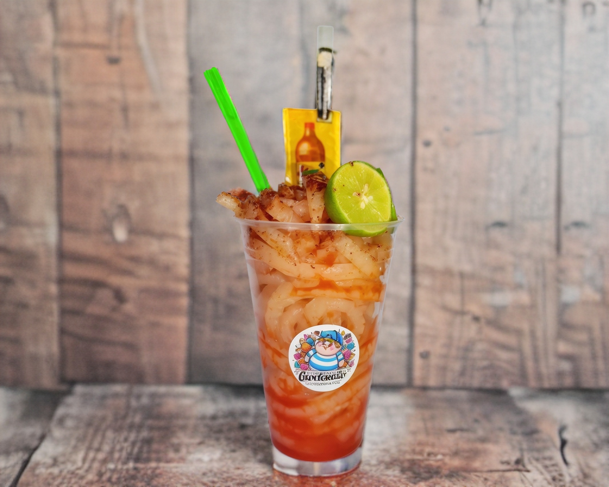 Vaso de cueritos lleno de cueritos enteros, bañadado en mezclas de salsas a elegir como botanera o valentina, chamoy original, miguelito o tajin, jugo de limon, jugo maggi.