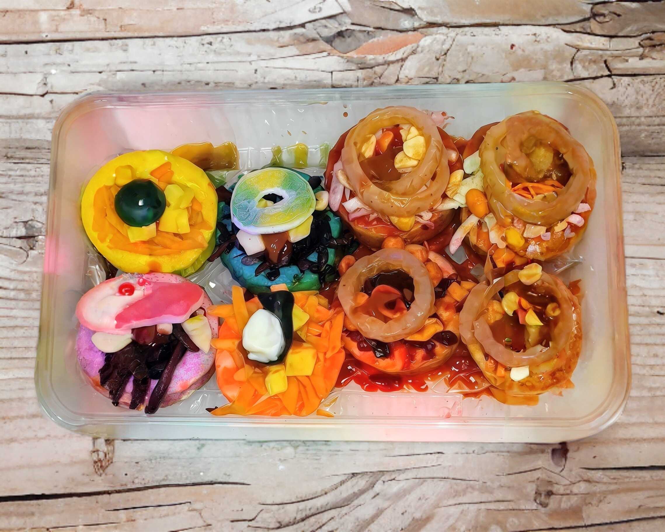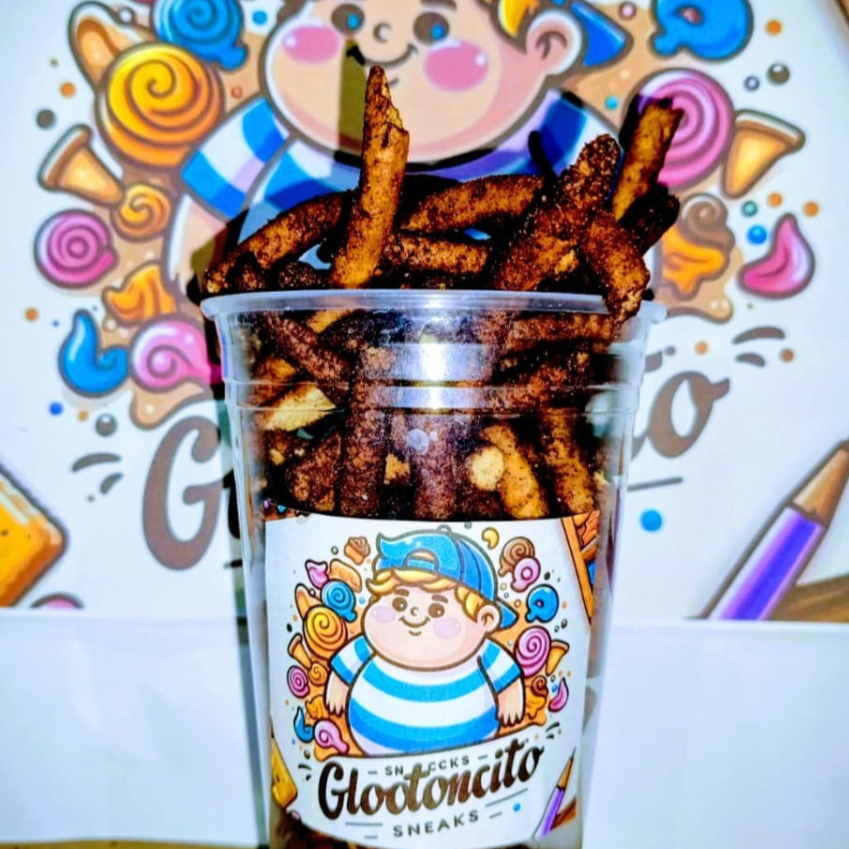 Deliciosos churritos de maiz, preparados con deliciosas y frescas frutas y verduras rayadas y picadas(zanahoria,jicama,betabel,pepino,mango,piña y melon), con cueritos a la diabla, acompañados de un mix de cacahuates y gomitas a tu eleccion, ademas de estar bañados en una mezcla perfecta de salsas atrevete a descubrir nuevos sabores, que se haran tus favoritos, solo en el Gloton. Especialidad⭐⭐⭐⭐⭐