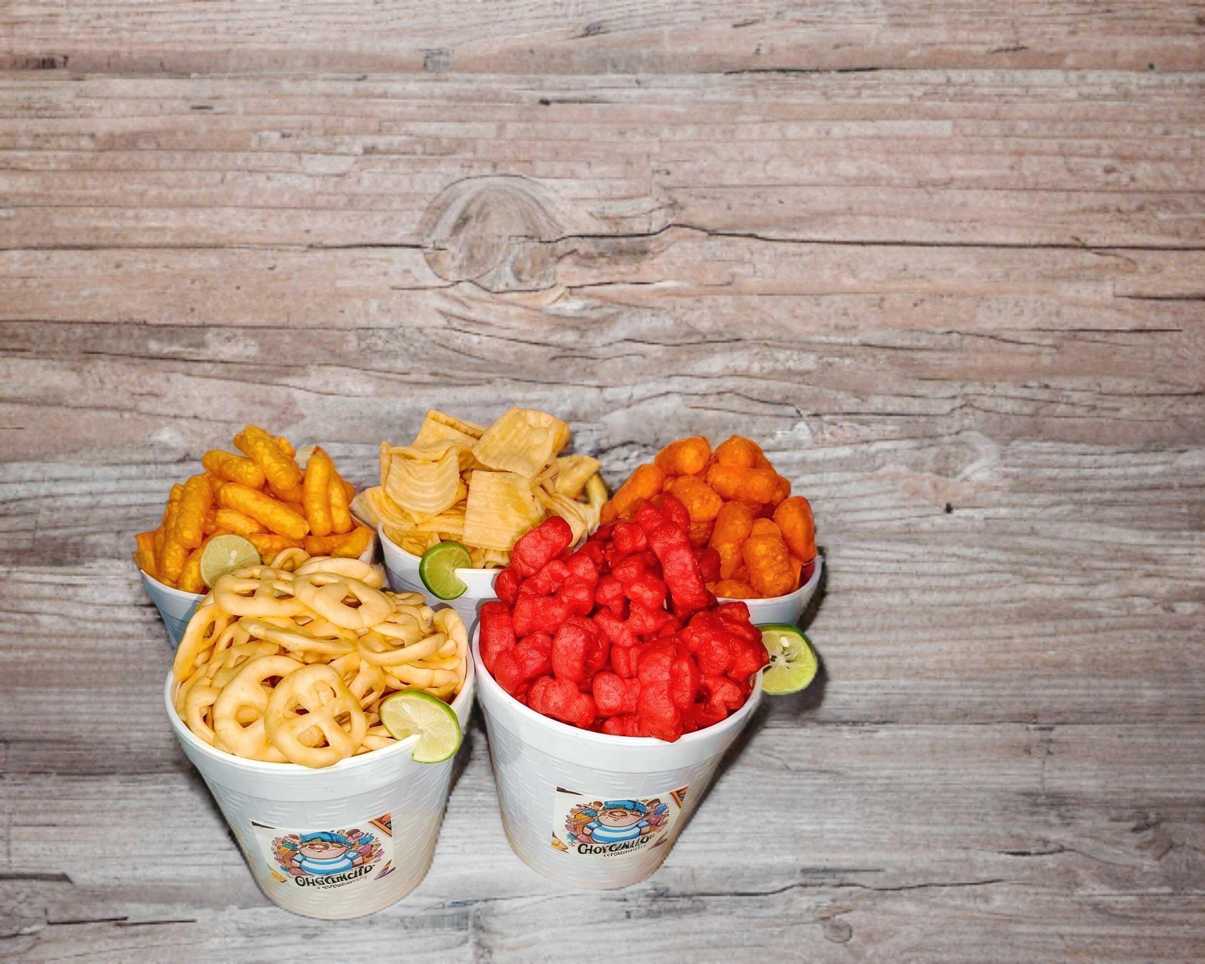 Bote repleto de chicharrones(cuadro, cheto queso, cheto jalapeño, rueda, cheto garra, rueda queso, rueda chipotle), bañados en salsa valentina o botanera, crema, jugo de limon fresco.