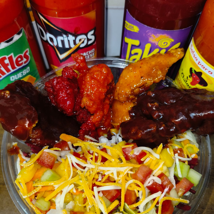 Las favoritas del Glotón: exquisitas tiras de pechuga de pollo empanizadas y bañadas en salsas unicas como takis, dorito nacho, rufles queso, bbq y mango habanero. acompañadas con fresca ensalada tradicional de la casa.