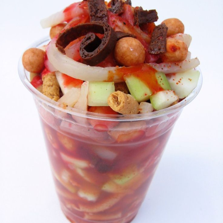 Vaso de medio litro, lleno de cueritos picados bañados en salsas de tu elección.