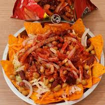 Charola de Dorilokos acompañado con pepino, zanahoria, jícama rallada, limón, cueritos, cacahuates, chamoy, salsas de la casa y gomitas.
