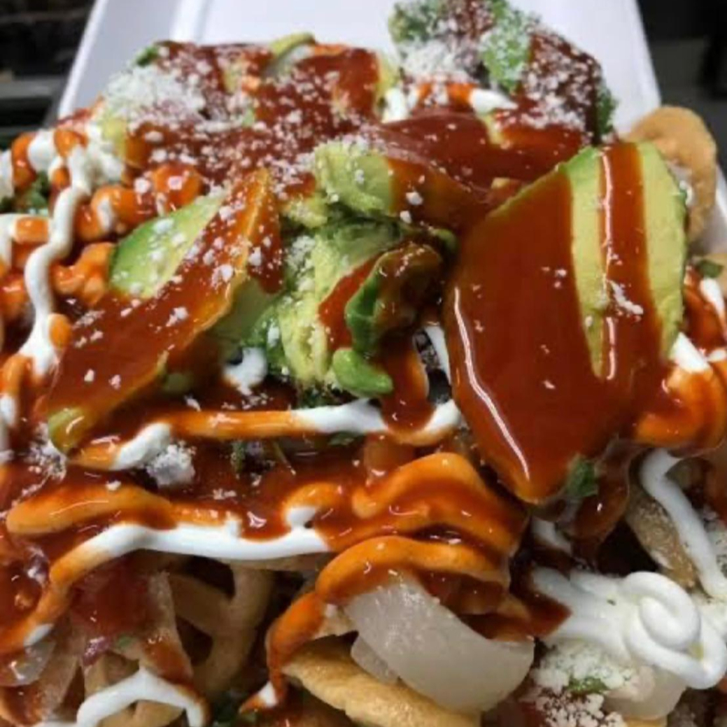 Chicharrones preparados col, jitomate, aguacate, crema, salsa y cueritos picados.