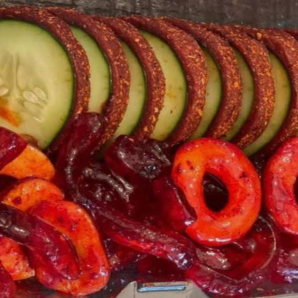 12 Ruedas de pepino enchilado acompañado con gomitas enchiladas bañado en chamoy