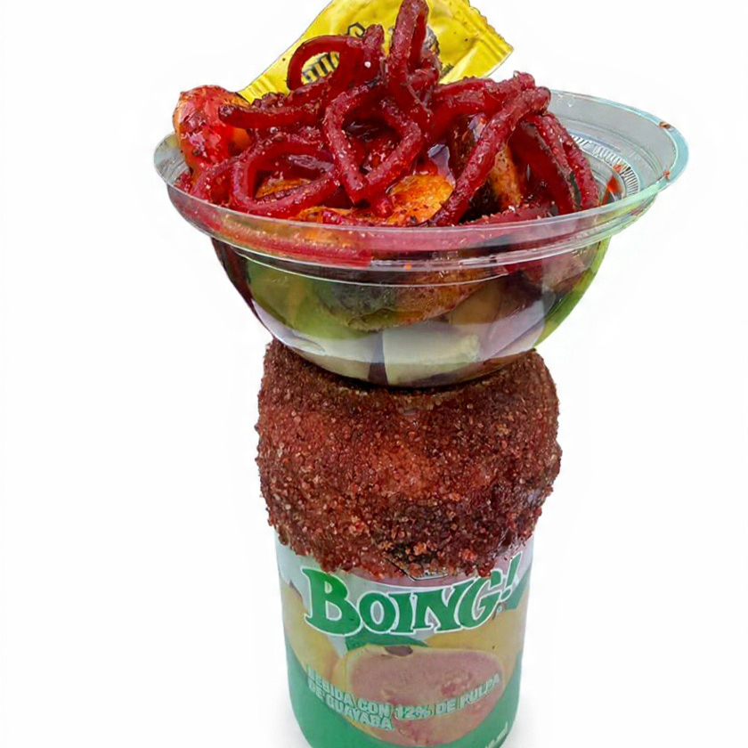 Boing congelado, preparado con chamoy, miguelito acompañado de gomitas