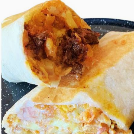 Burrito de huevo con chilorio, queso gouda, frijoles y trozos de papa Hash Brown.