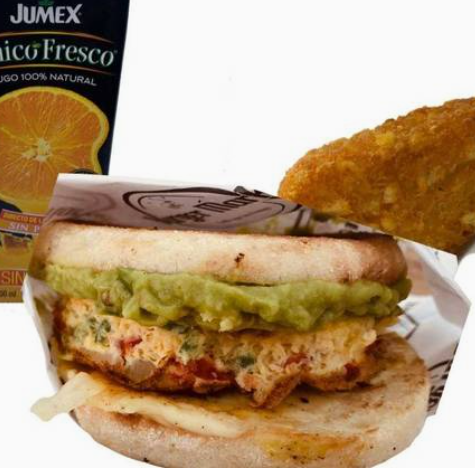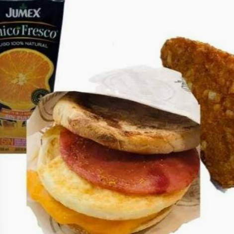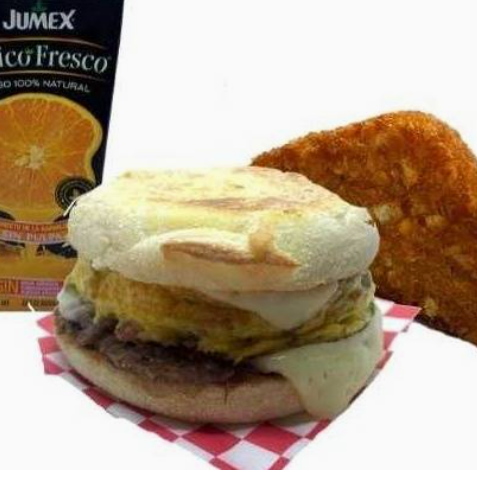 Combo Sándwich de English Muffin a la Mexicana, papa hash brown y jugo, leche o café.
