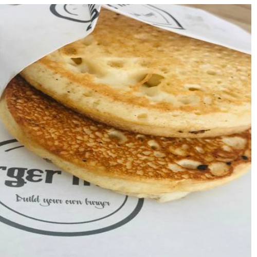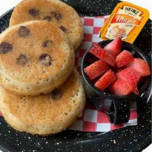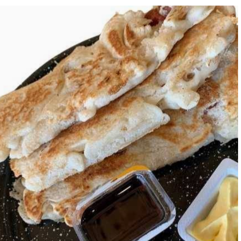 Tres tiras de tocino, cubiertas de masa hot cakes, acompañadas de miel maple.
