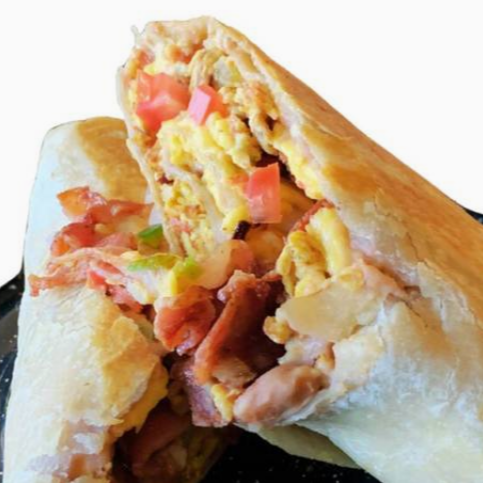 Burrito de huevo a la mexicana (cebolla, jitomate y chile), frijoles, queso americano y tocino.