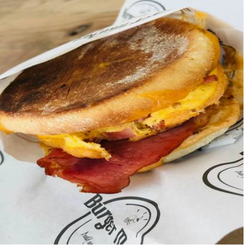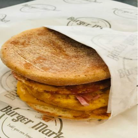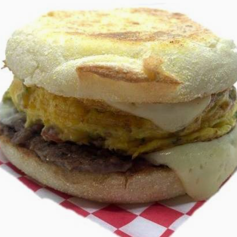 Sándwich con pan de english muffin, con huevo, jamón, tocino y queso cheddar.
