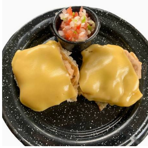 Dos bollos con frijoles refritos, queso Gouda y pico de gallo.