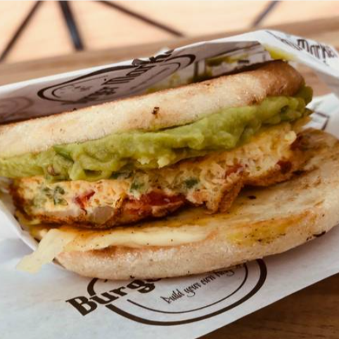 Sándwich con pan de english muffin, huevo a la mexicana, guacamole y queso gouda.