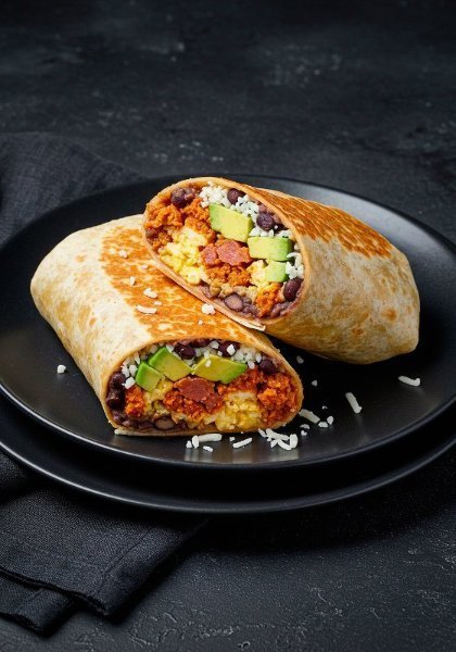 Deliciosos burrito relleno de huevo chorizo frijoles queso derretido y aguacate fresco.