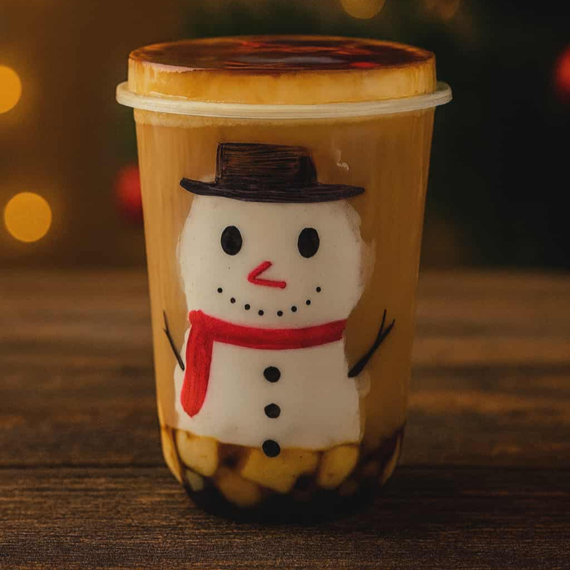 Sabor brown sugar con flan, un monito de nieve hecho de crema de malvavisco y una capa de bubli nube