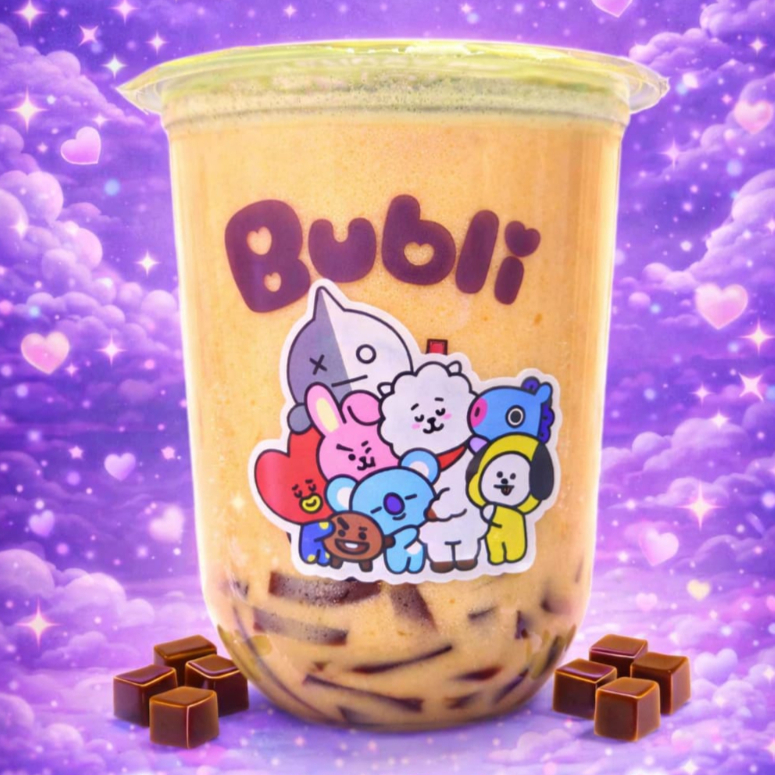 sabor galletas biscoff lotus con perlas de tapioca, una capa de bubli nube (espuma densa y dulcecita) y crumbles de galleta biscoff lotus, preparada con leche deslactosada