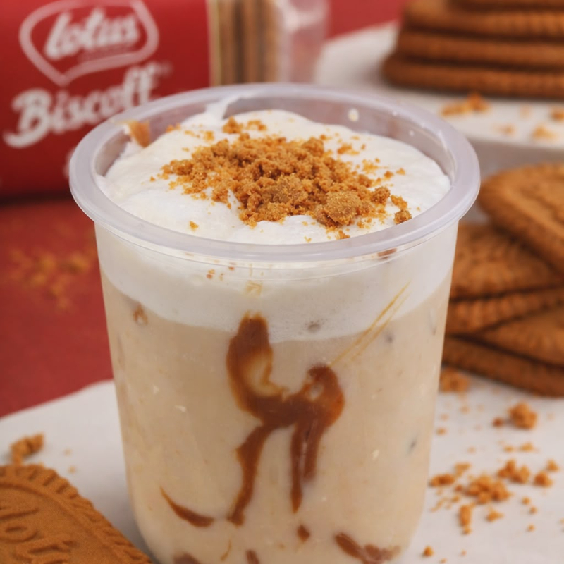 Bebida a base de leche deslactosada, sabor biscoff lotus con perlas de tapioca, una capa de bubli nube y crumbles de galleta biscoff lotus.