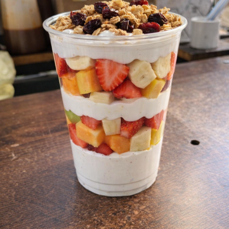Cóctel de Frutas con Yogurt Griego Yoplait preparado al momento en vaso transparente, con 3 capas de yogurt (abajo, en medio y arriba) para un sabor más cremoso y delicioso. Incluye fruta fresca en trozos grandes, granola crujiente, arándanos y pasas como topping.