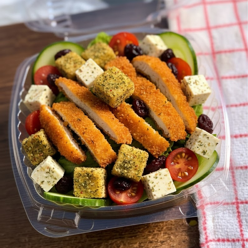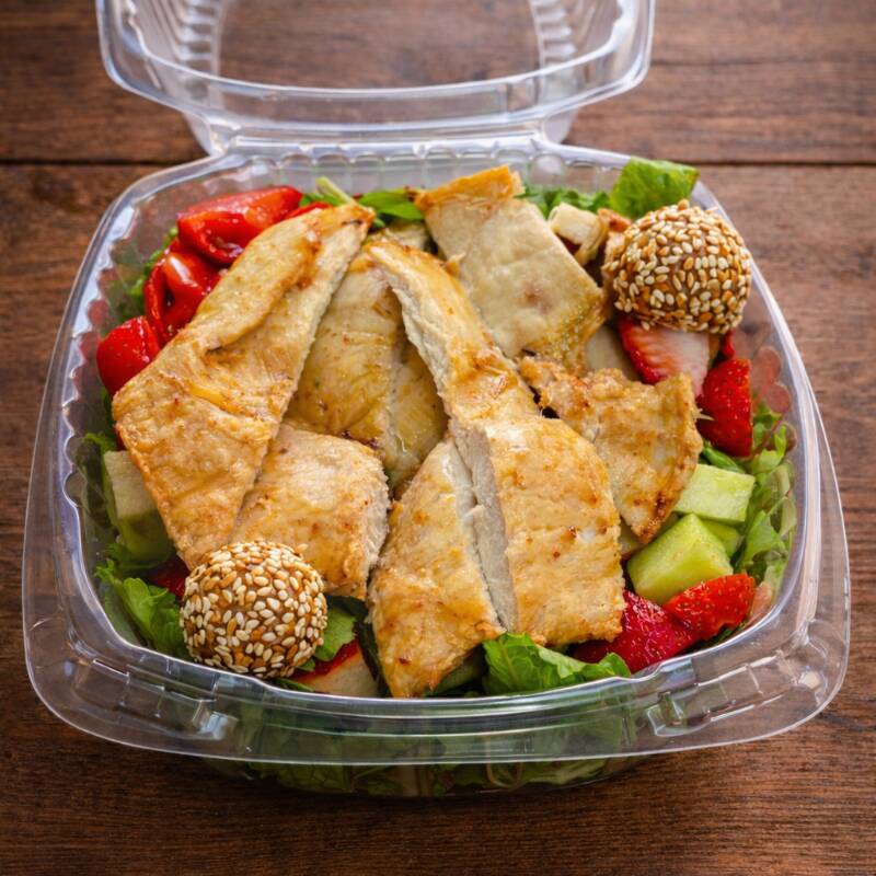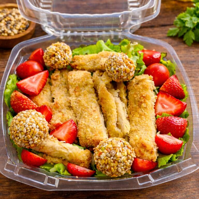 Crujiente pechuga de pollo empanizada, cocinada en freidora de aire sin aceite, servida sobre lechuga y espinaca, con jitomate cherry, fresas, manzana verde y arándanos. Incluye bolitas de queso tipo Philadelphia cubiertas con ajonjolí y un ligero toque de miel, logrando un balance perfecto entre crujiente y fresco.