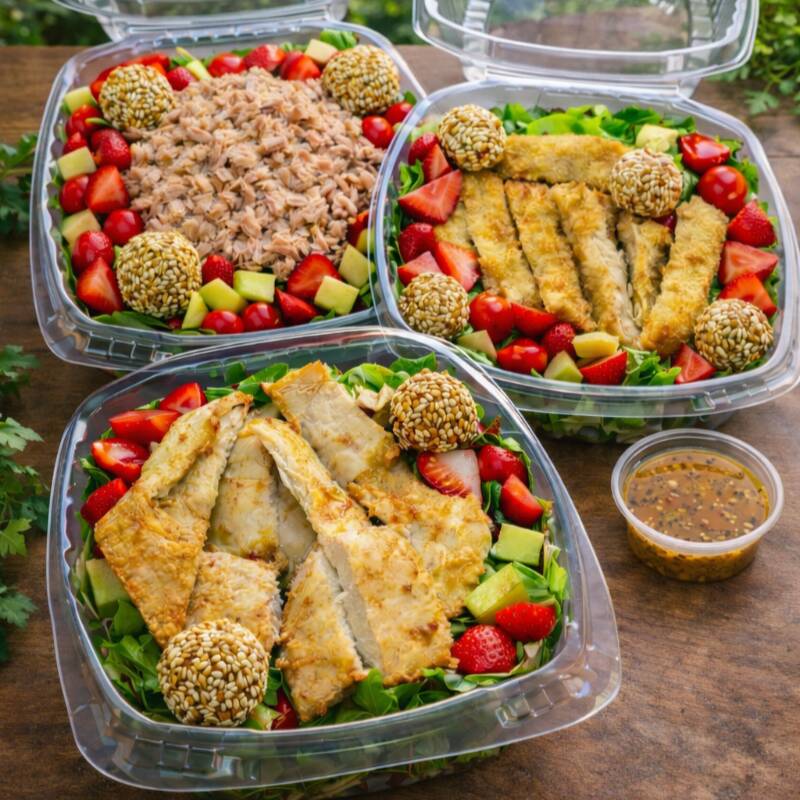 Ensalada fresca preparada con pechuga de pollo cocinada en freidora de aire sin aceite, acompañada de lechuga fresca, jitomate cherry, pepino, manzana verde y fresas naturales. Incluye crutones italianos crujientes, un toque de granola para mayor textura y sabor, y nuestras bolitas de queso tipo Philadelphia cubiertas con ajonjolí garapiñado.