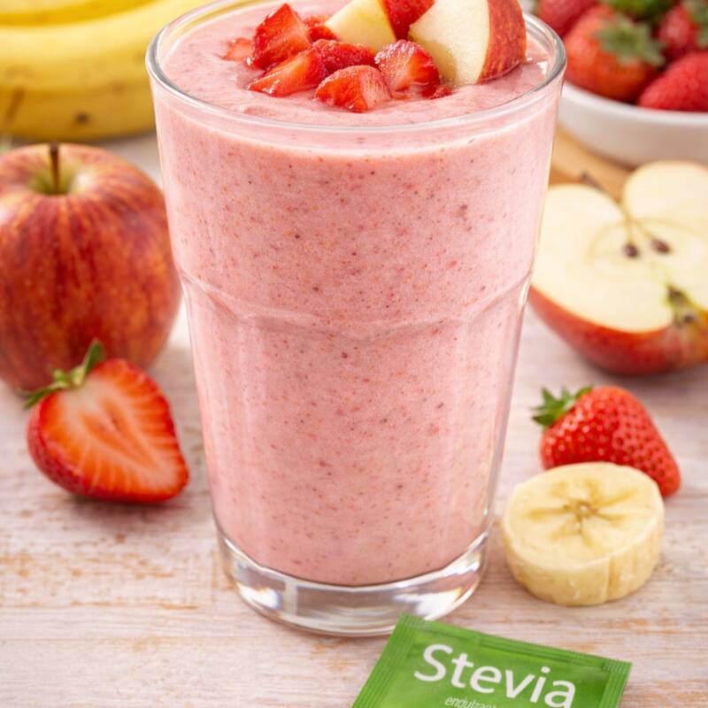 Delicioso licuado preparado con plátano maduro, fresa fresca y manzana natural, mezclados con leche a elección y endulzado ligeramente con stevia. Cremoso, refrescante y perfecto para acompañar tu desayuno o disfrutar como una opción saludable en cualquier momento del día.