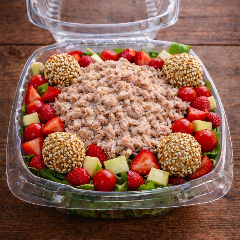 Ensalada preparada con atún en agua, bajo en grasa y alto en proteína. Acompañada de lechuga y espinaca fresca, jitomate cherry, fresas, manzana verde y arándanos, con bolitas de queso tipo Philadelphia con ajonjolí y un toque suave de miel que realza el sabor. Fresca y nutritiva.