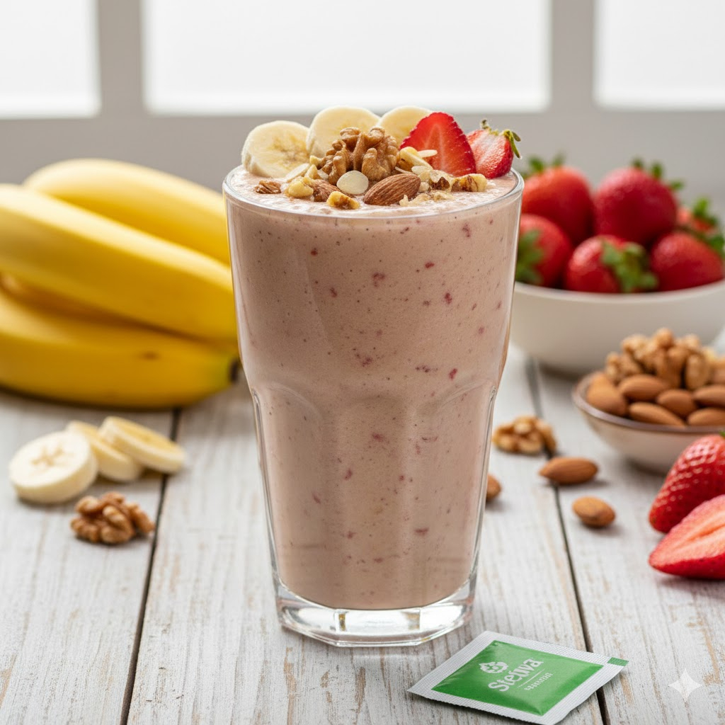 El balance perfecto en un vaso! Delicioso licuado cremoso de fresas frescas y plátano maduro, potenciado con el toque crujiente de nueces selectas y almendras fileteadas. Endulzado naturalmente y preparado al momento para acompañar tu desayuno o saciar tu antojo de media tarde