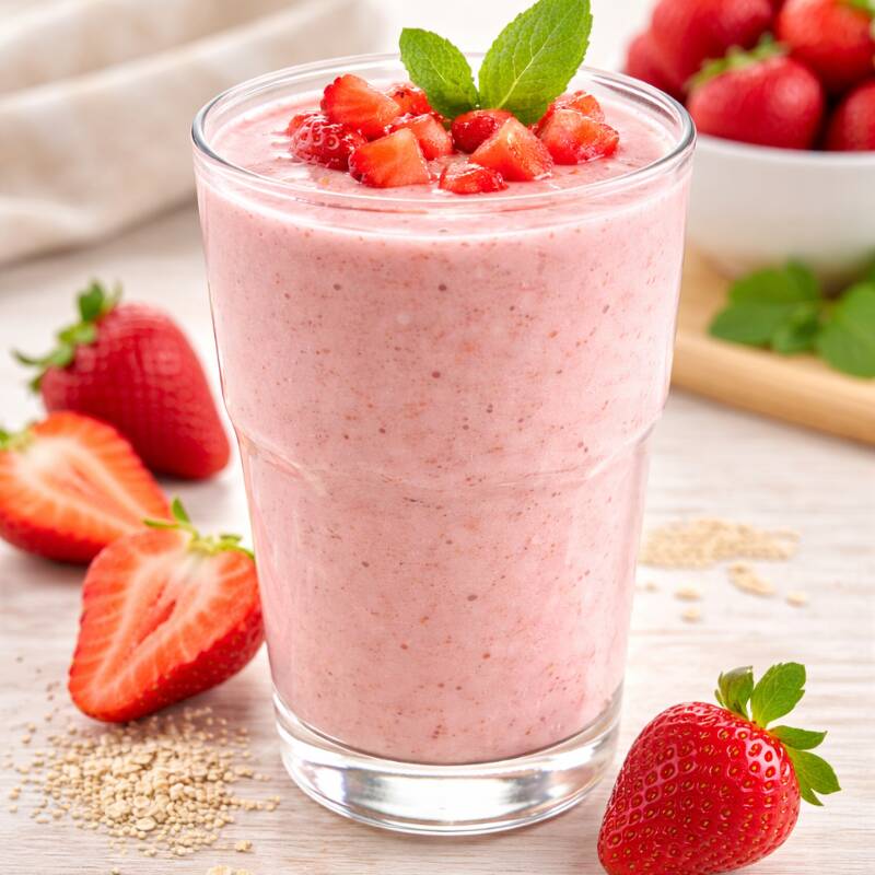 Delicioso y cremoso licuado preparado con fresas frescas y leche, ideal para comenzar el día.