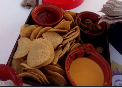 Nachos acompañados de queso amarillo, cátsup y jalapeños.