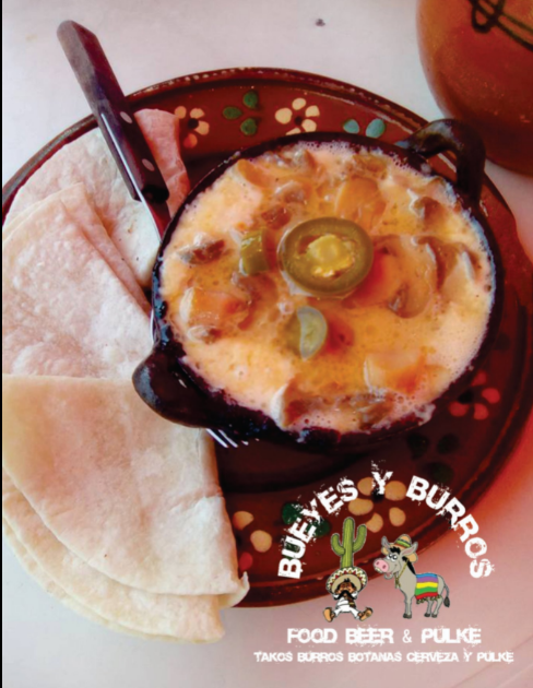 1/4 kg de queso oaxaca fundido en cazuela de barro con bistec, longaniza y chiles jalapeños de adorno acompañado de 3 tortillas de harina.