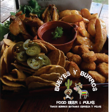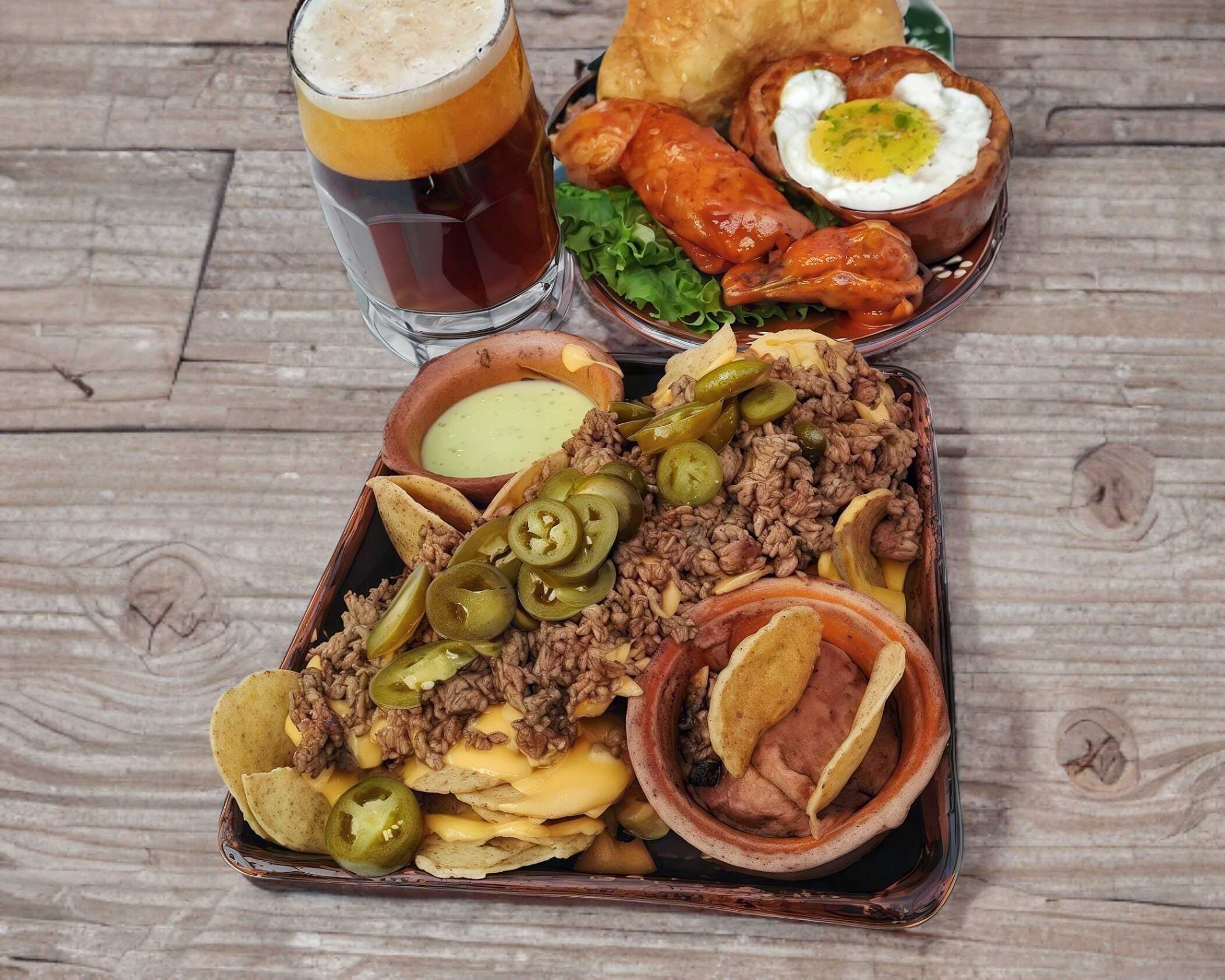 Nachos bañados de queso amarillo acompañados de frijoles, salsa guacamole o pico de gallo con carne campechana o bistec o carne al pastor y chiles jalapeños.