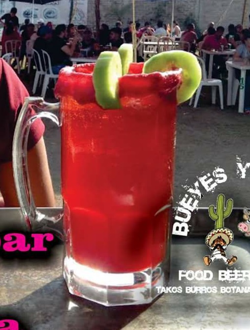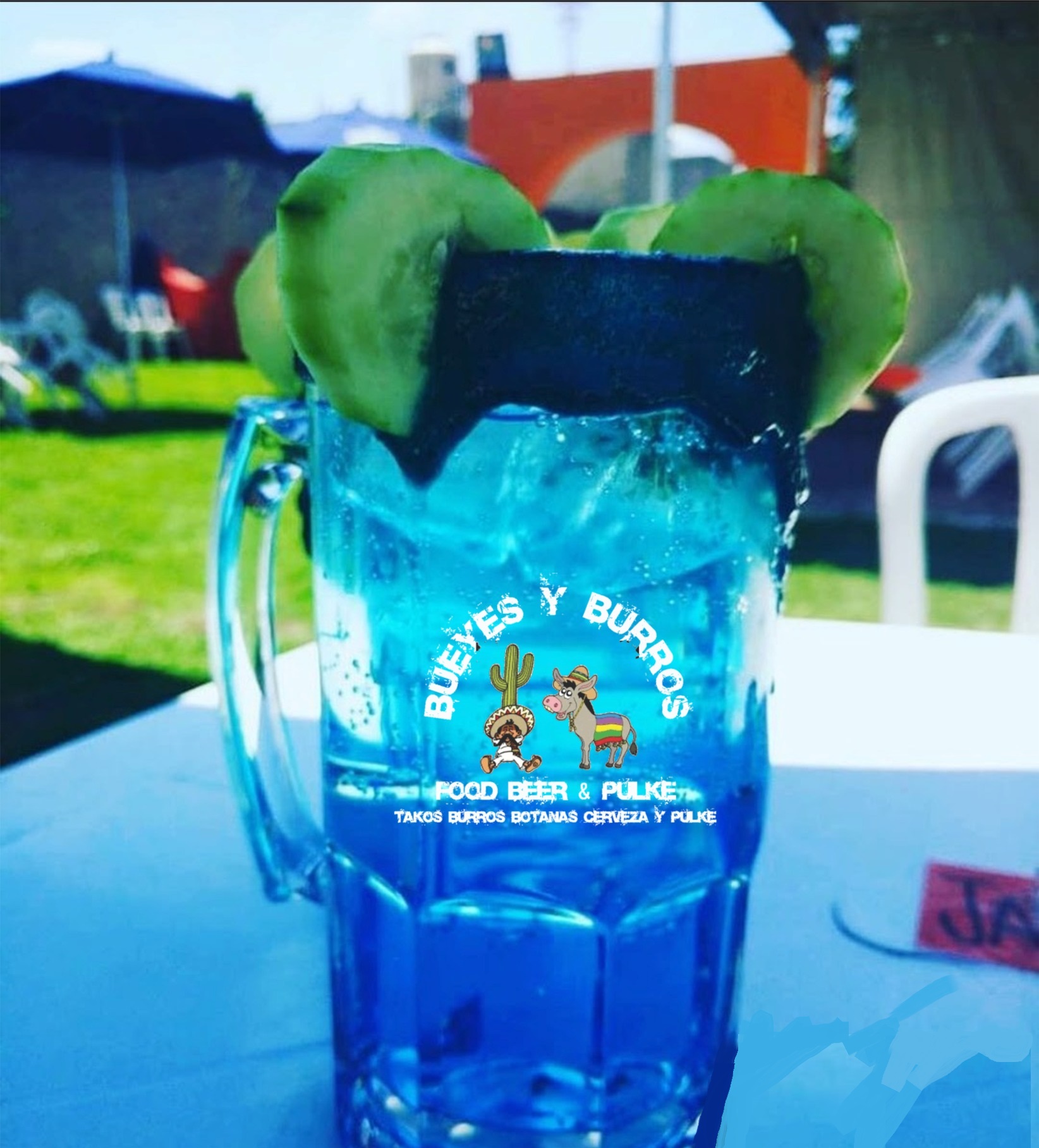 Servida en tarro escarchado de chilito con limón, sal y hielo.