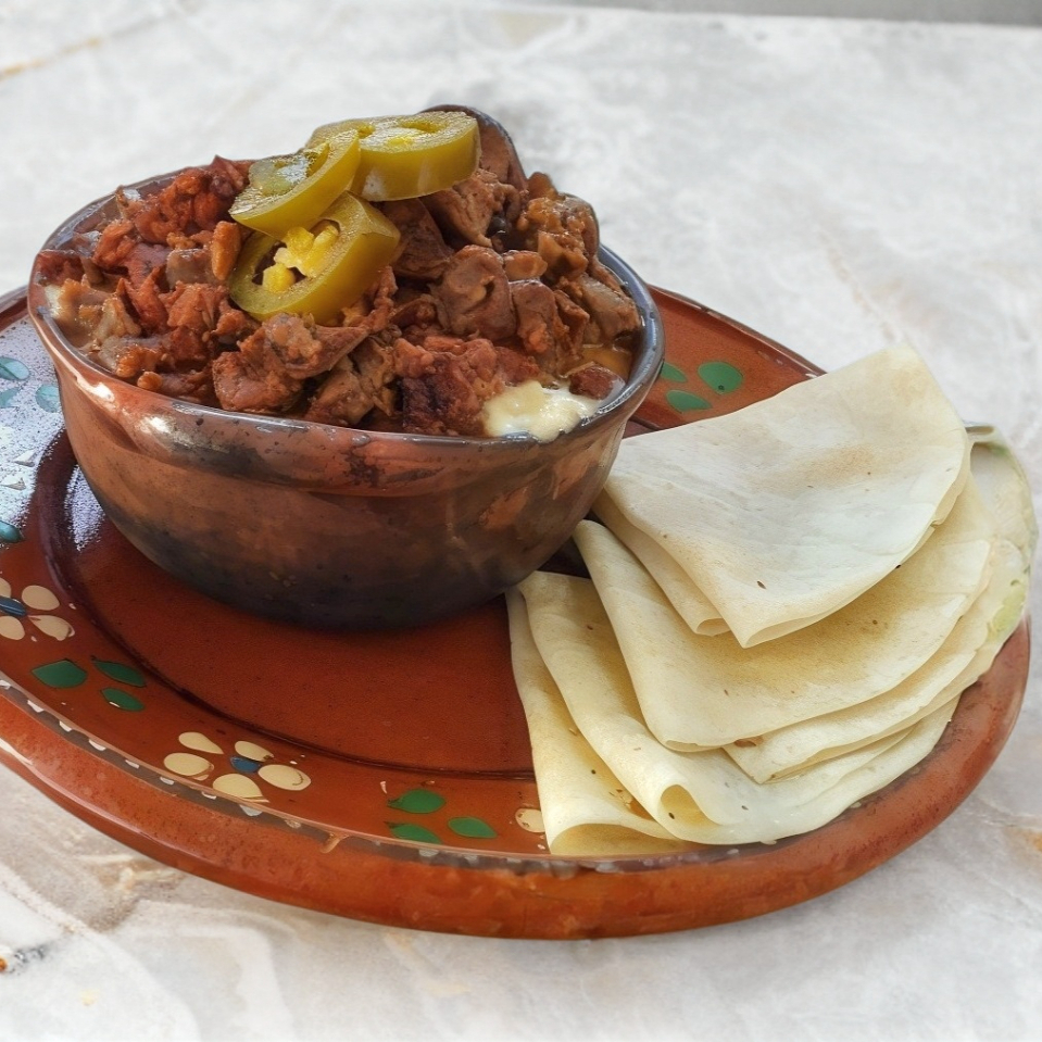 1/2 kg de queso oaxaca fundido en cazuela de barro con carne campechana, champiñones y chiles jalapeños de adorno, acompañado de 6 tortillas de harina.