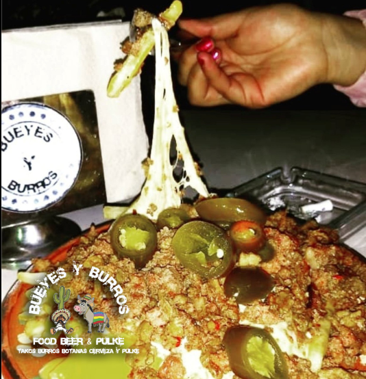 Papas a la francesa salpimentadas bañadas de queso amarillo y gratinadas con queso oaxaca, acompañadas con carne campechana o bistec o carne al pastor y jalapeños.