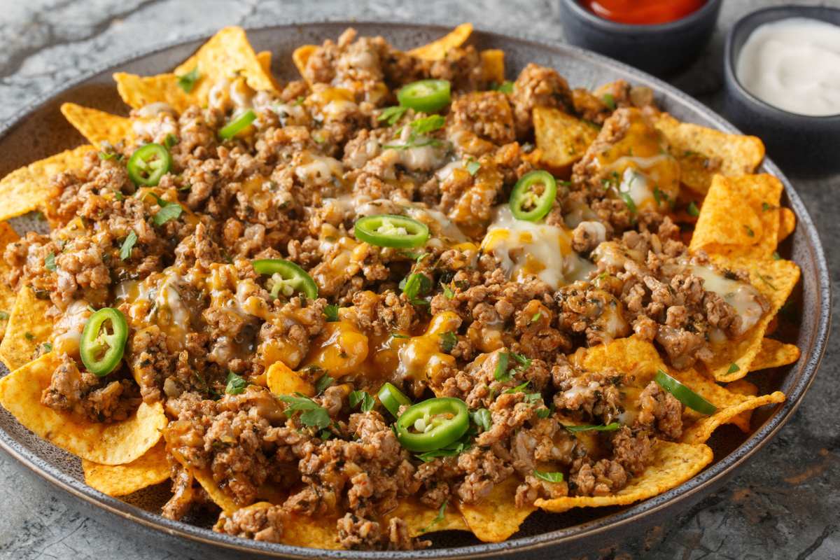 Nachos con queso cheddar y carne molida.