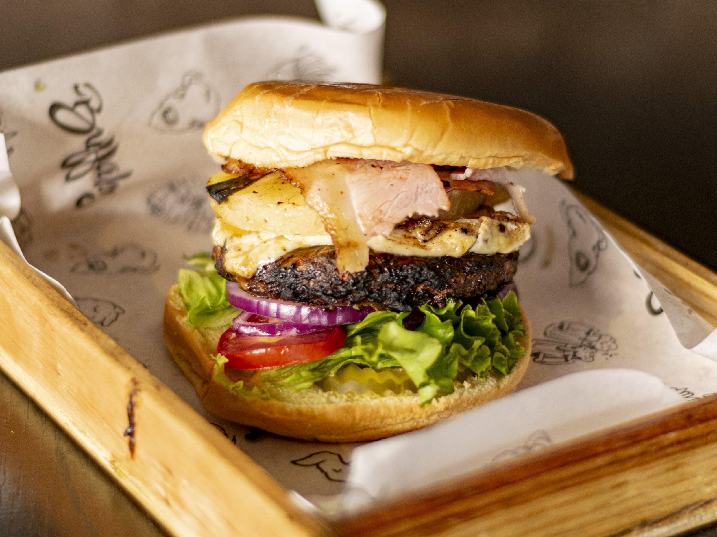 Carne de res, queso Oaxaca, piña, tocino, lechuga, jitomate y jalapeños.