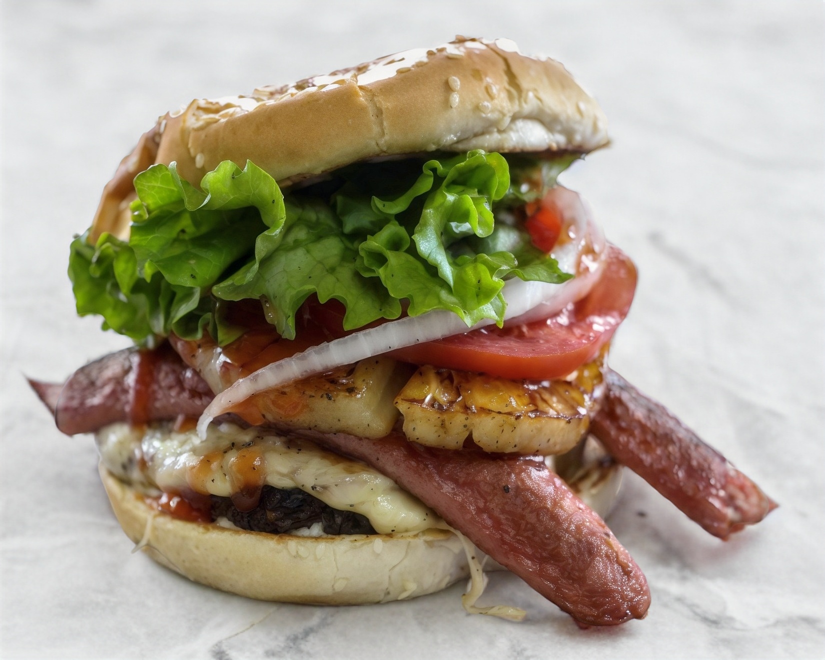 200g de Carne de res gratinada con queso oaxaca, piña y tocino asado, cebolla, jitomate y catsup.