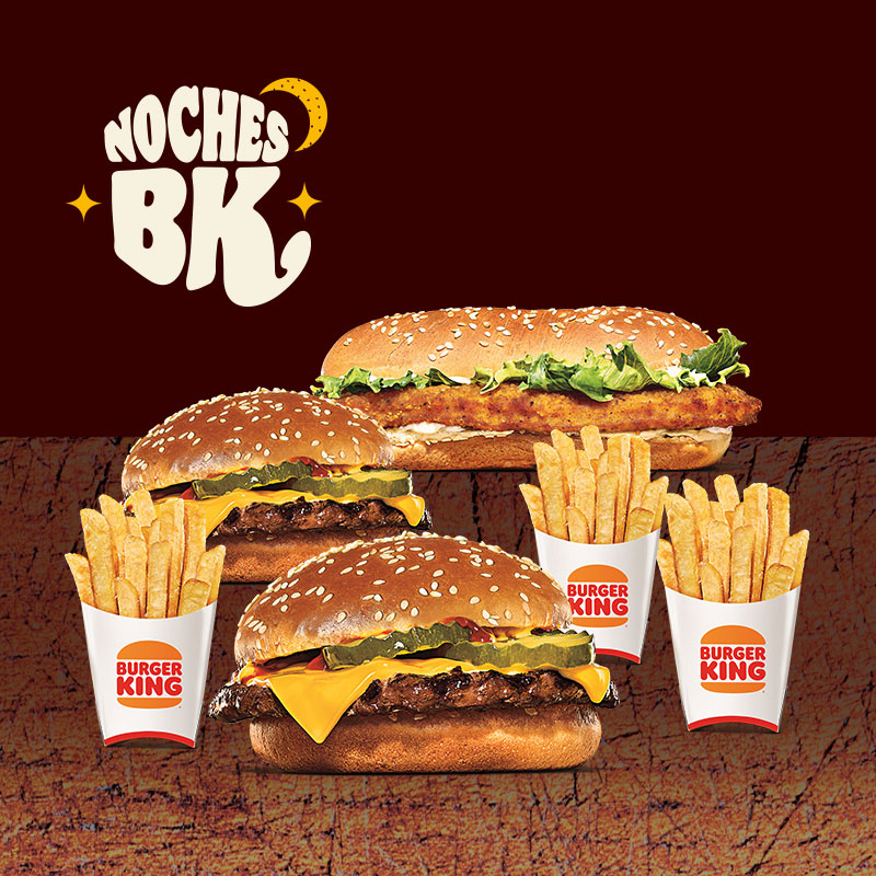 Las noches del Rey son para compartir con: 2 Hamburguesas con queso + 1 King de Pollo con queso + 3 papas chicas.
