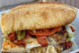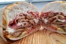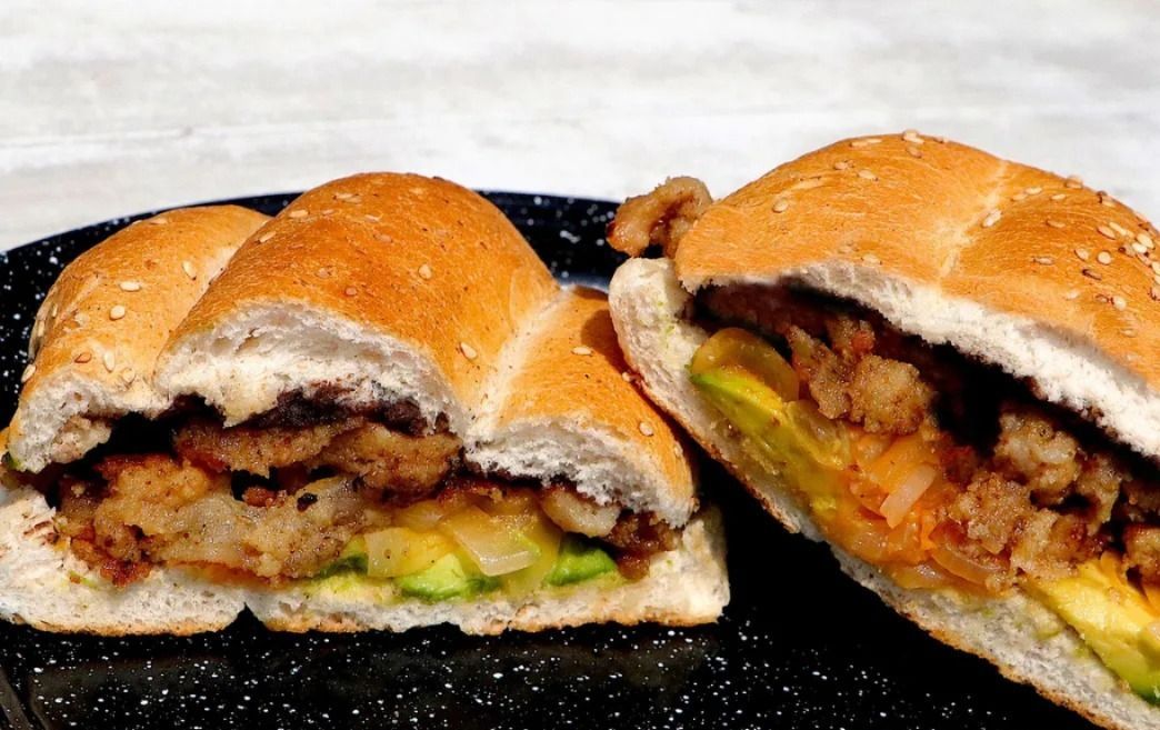 Sabrosa torta con milanesa, chorizo y quesillo, en telera de tanto y 1/2