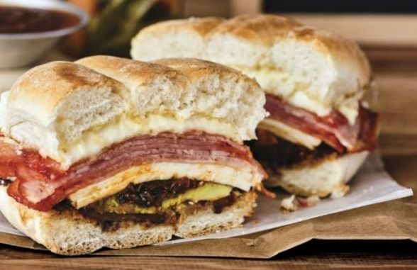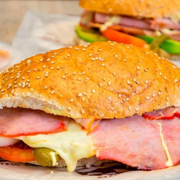 Sabrosa torta con milanesa, pierna y quesillo en telera de tanto y 1/2