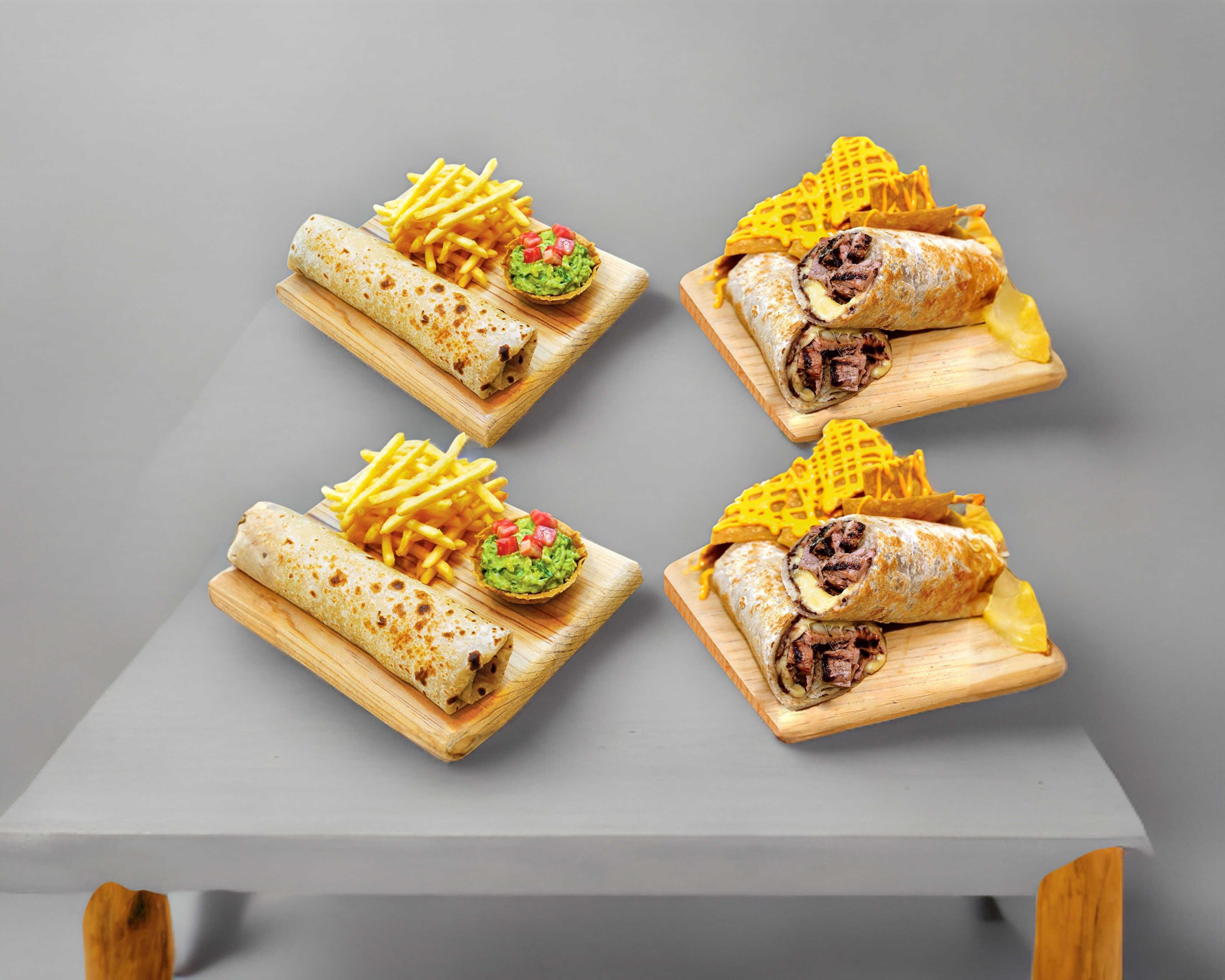 2 Burritos de arrachera con nachos y queso y 2 Burritos de pastor con papas a la francesa y guacamole.