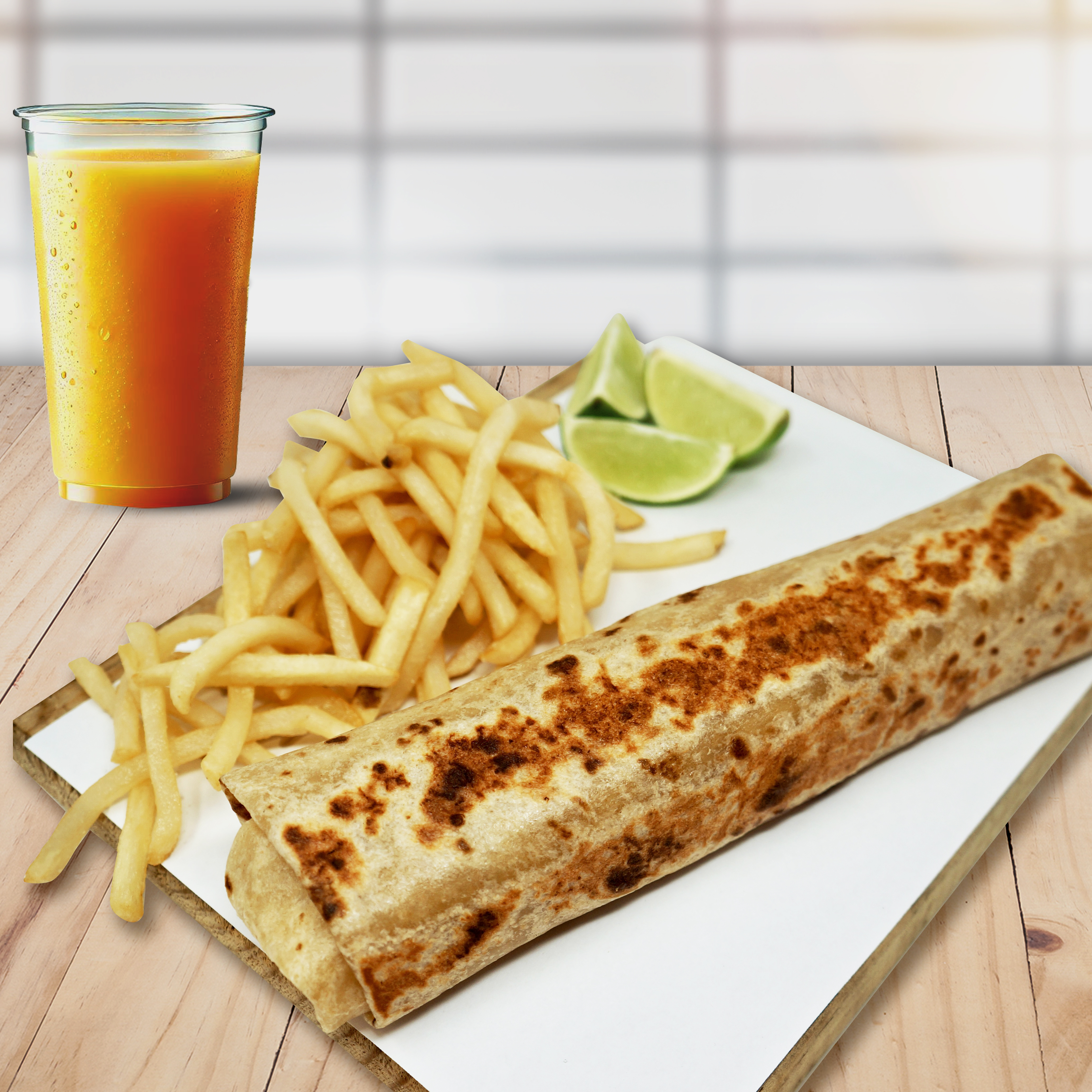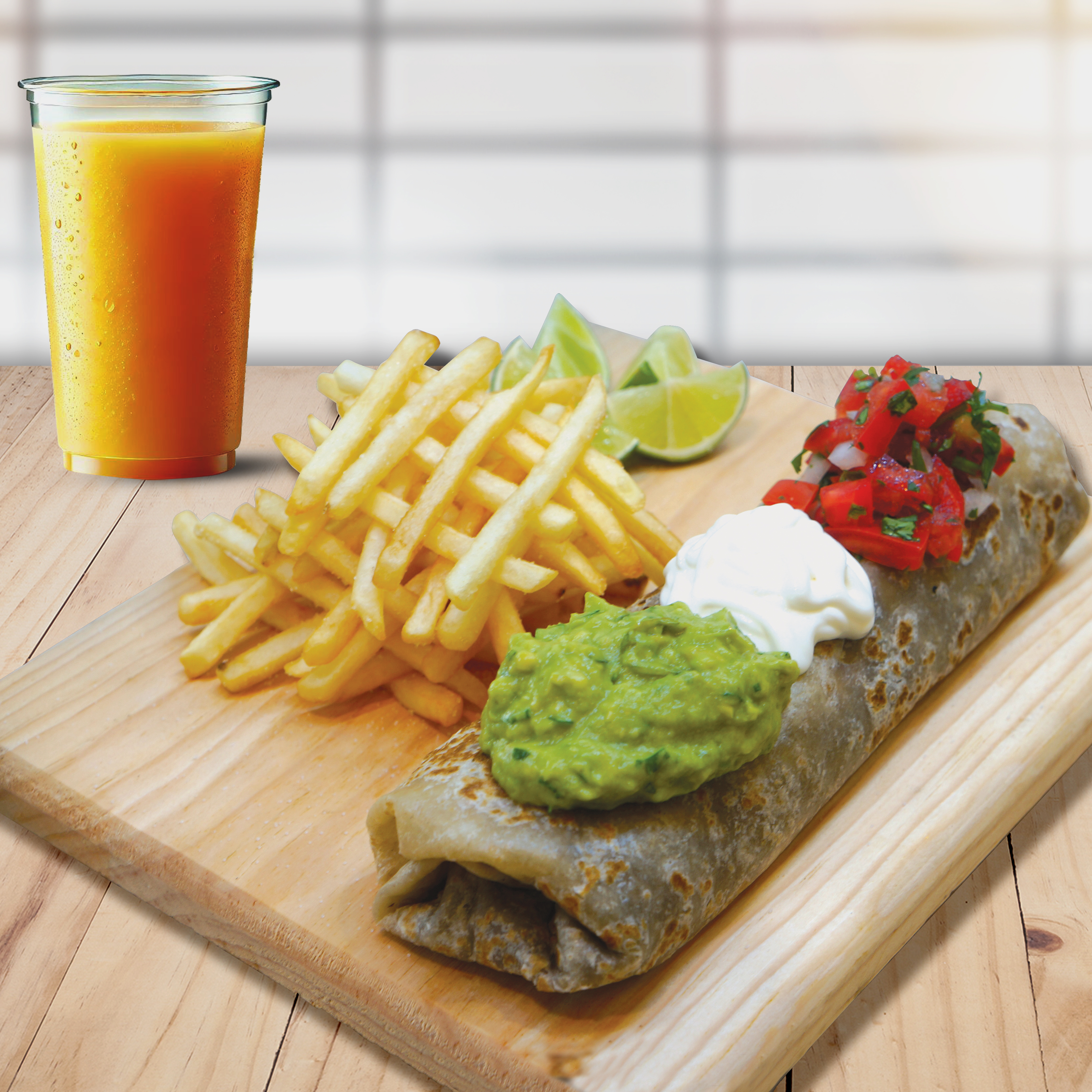 Burrito relleno de frijoles refritos, arroz, rajas poblanas con crema y queso. Acompañado de papas a la francesa. Incluye agua del día.