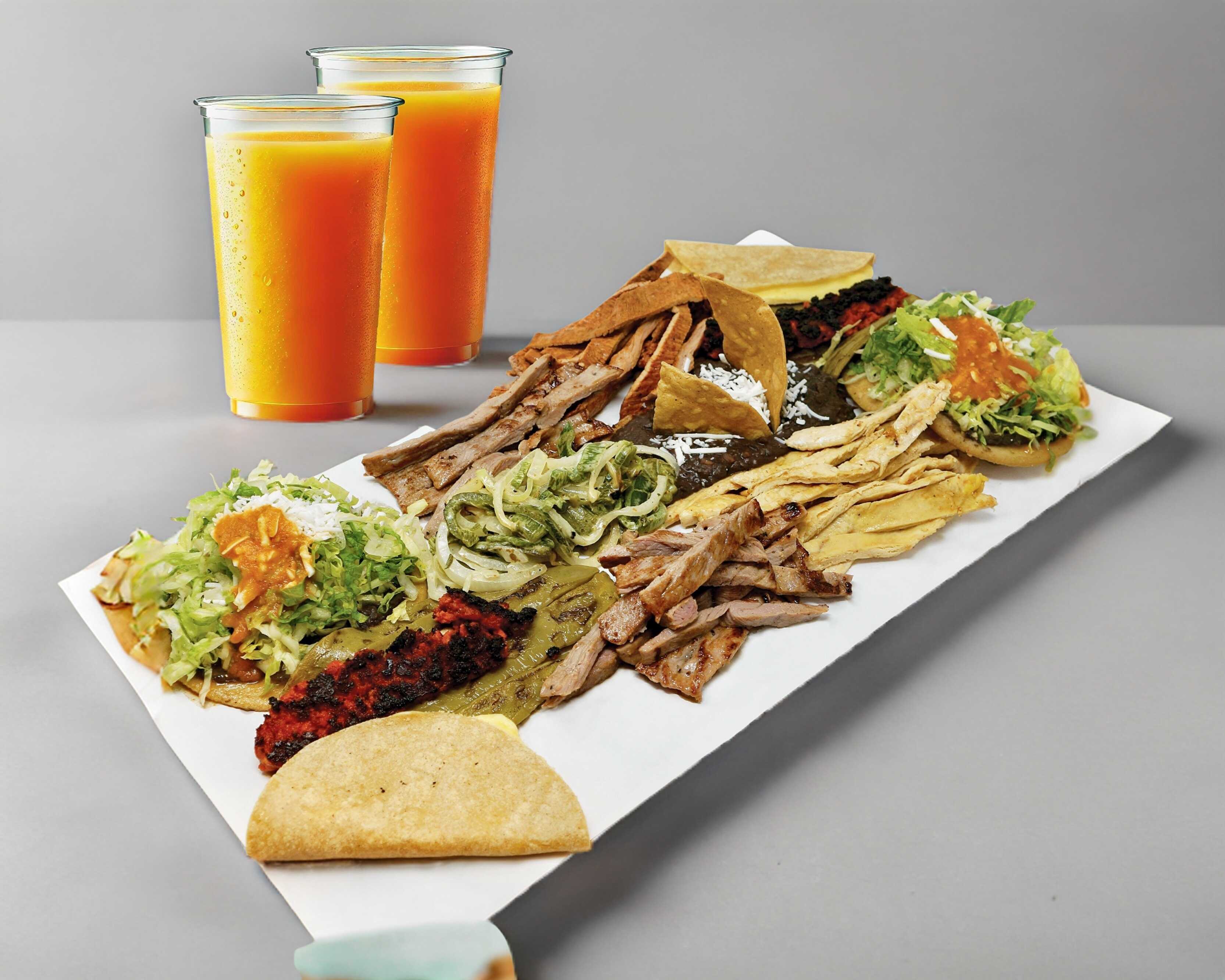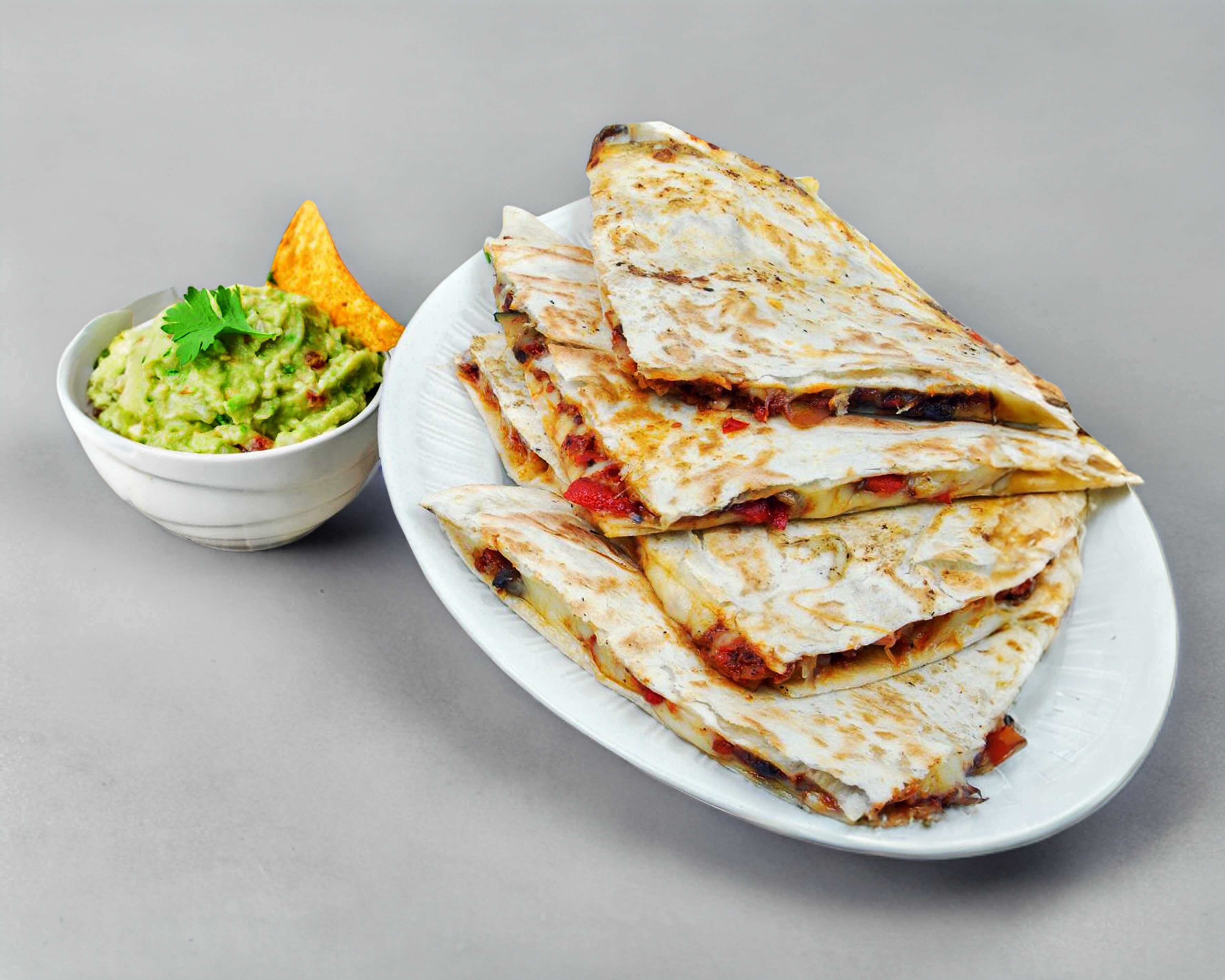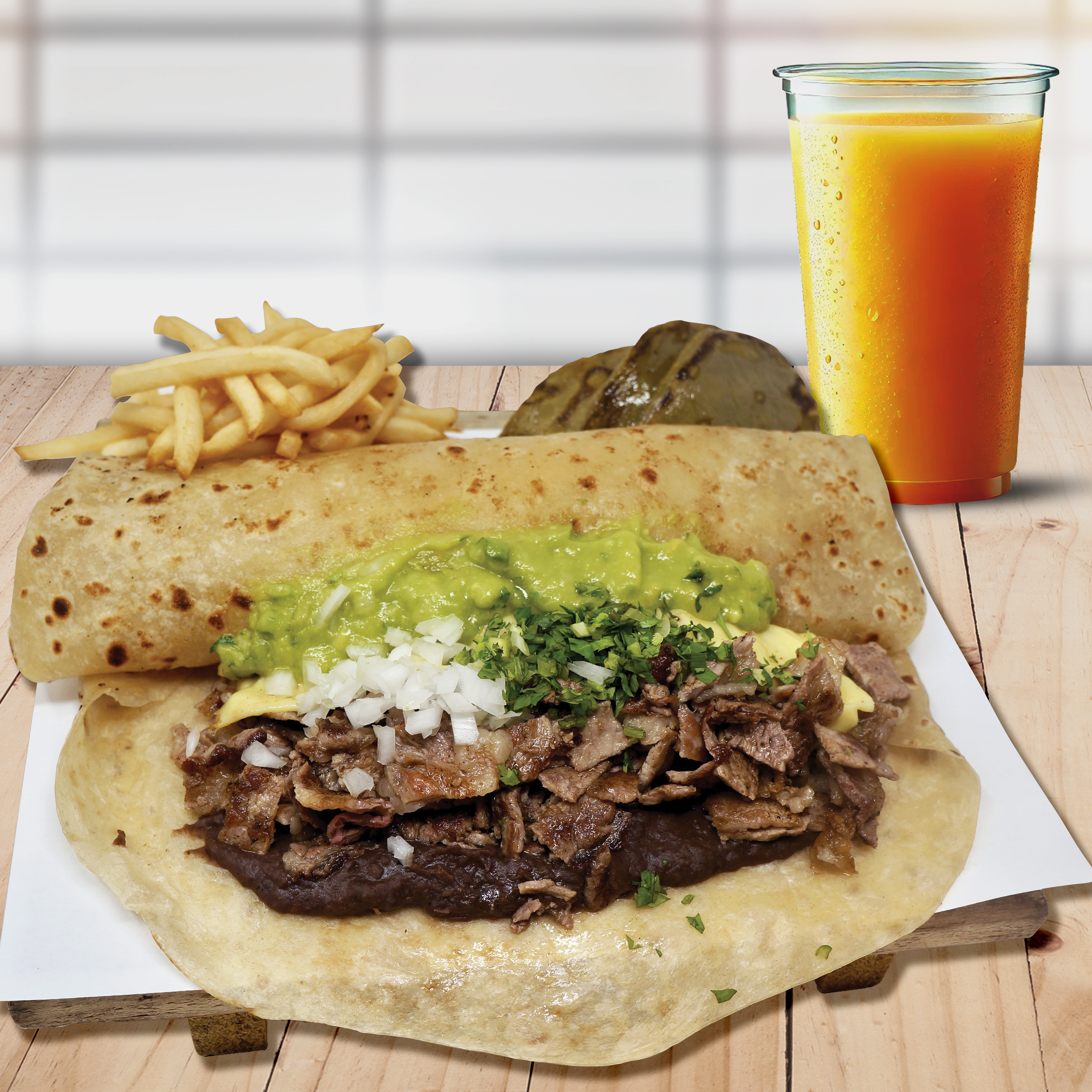 Tortilla de harina gigante, rellena de carne al pastor y queso derretido. Acompañada de guacamole, piña, cebollita y cilantro fresco. Incluye agua del día.