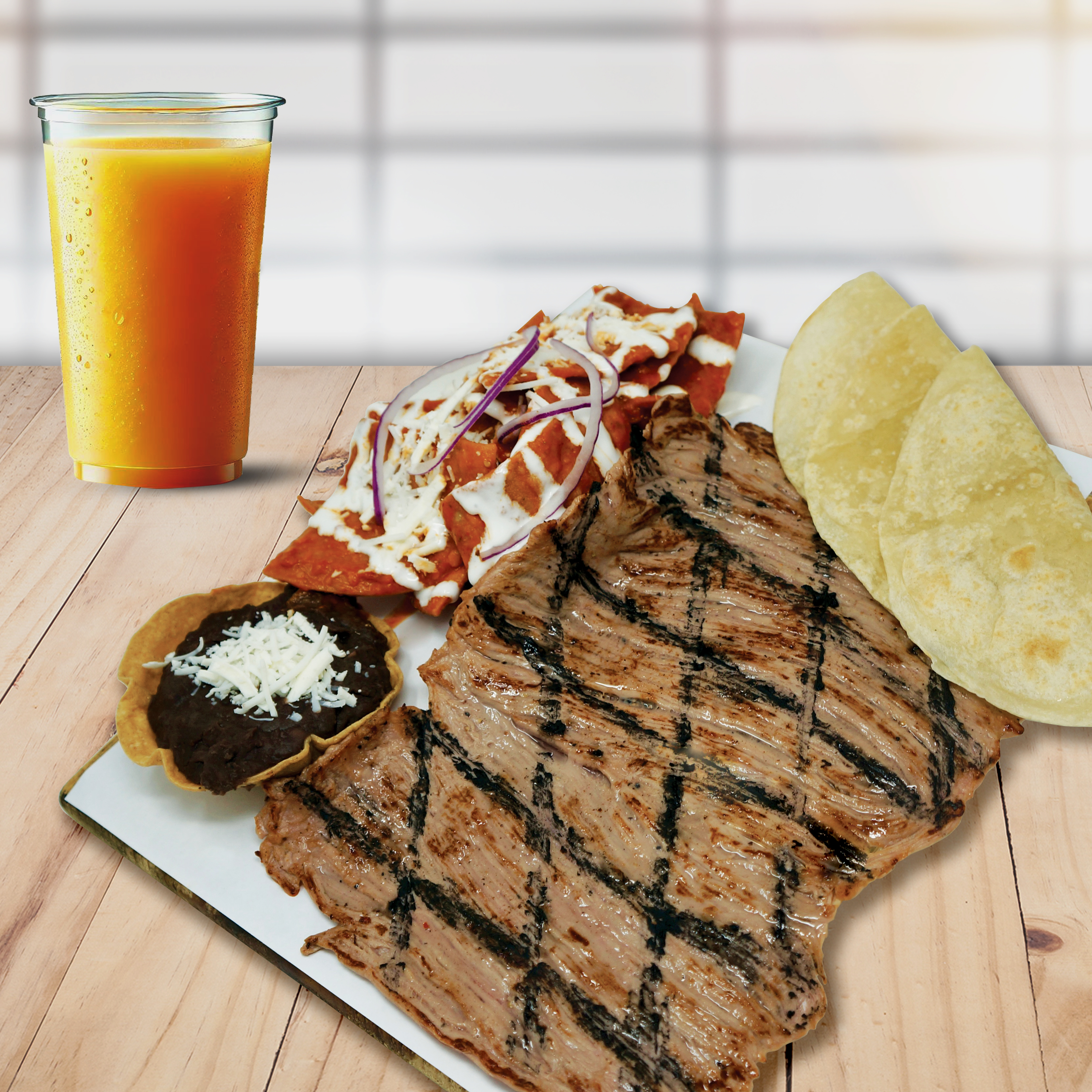 Arrachera. Acompañada de chilaquiles rojos, frijoles y tortillas de harina. Incluye agua del día.