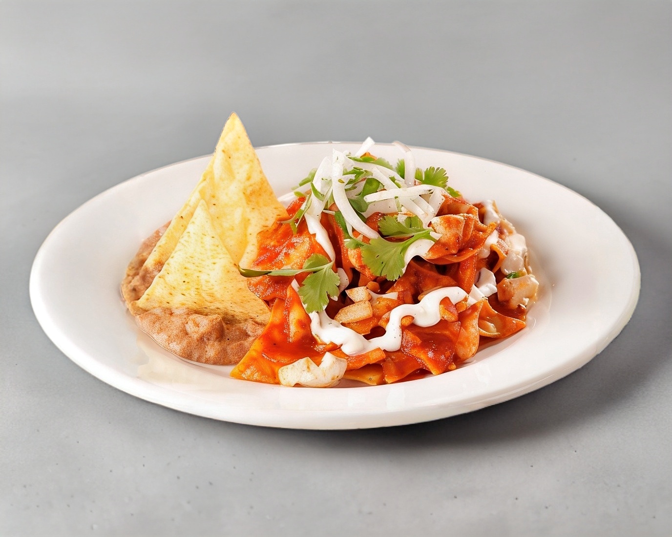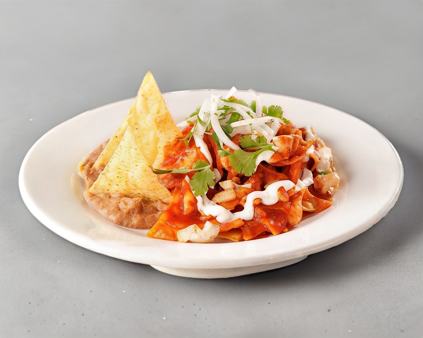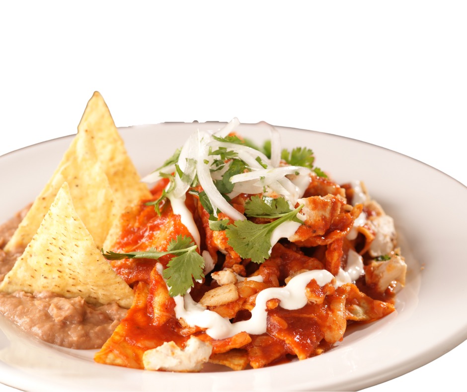 Deliciosos chilaquiles rojos con pollo, acompañados de frijoles refritos recién hechos.