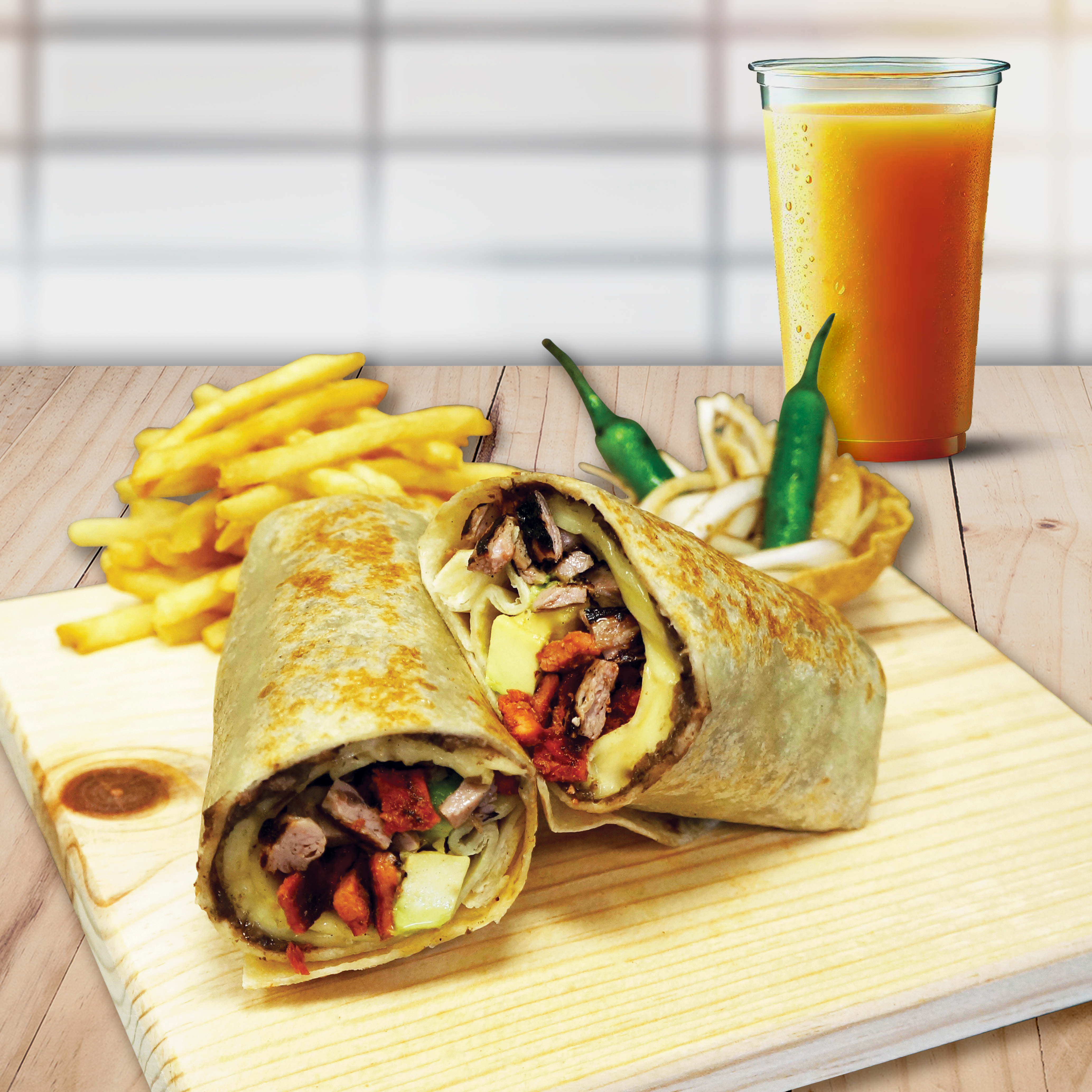 Burrito relleno de arrachera, Pastor, queso, frijoles y aguacate. Acompañado de papas a la francesa y chiles toreados, Incluye agua del día.