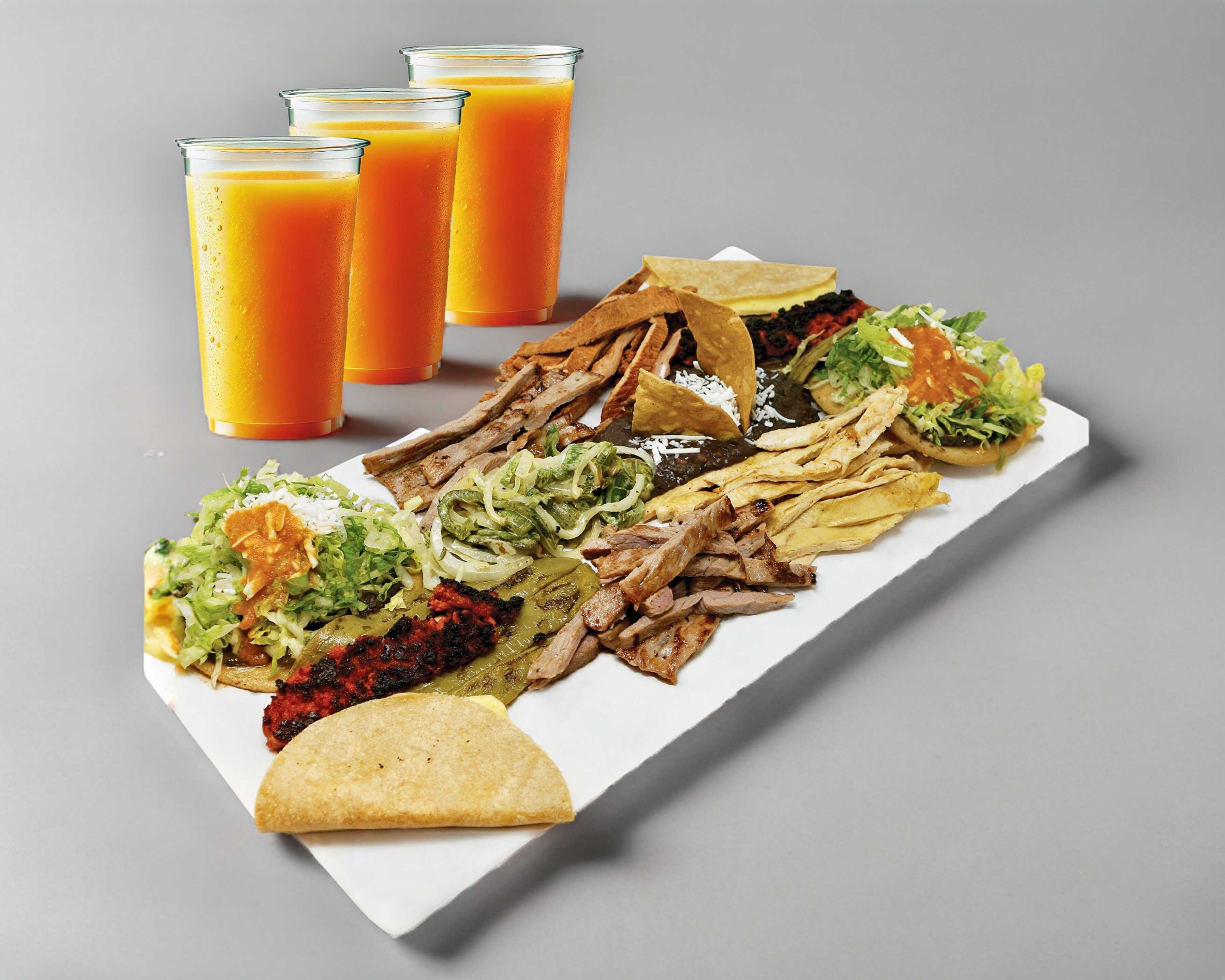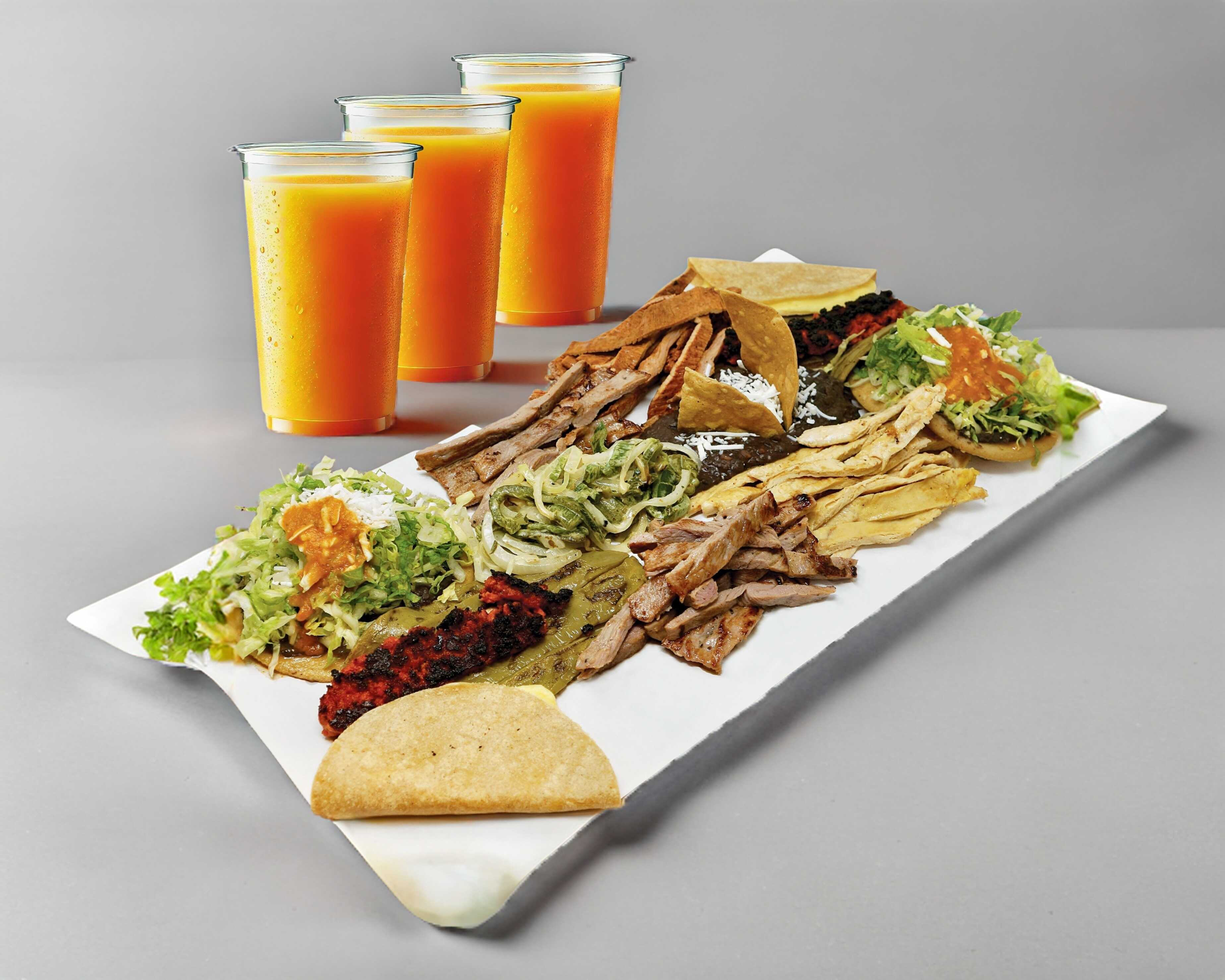 Alambre de arrachera, pollo, pastor y cecina, con cebolla y pimiento. Acompañado de papas a la francesa, guacamole, frijoles y tortillas de maíz. Incluye agua del día.