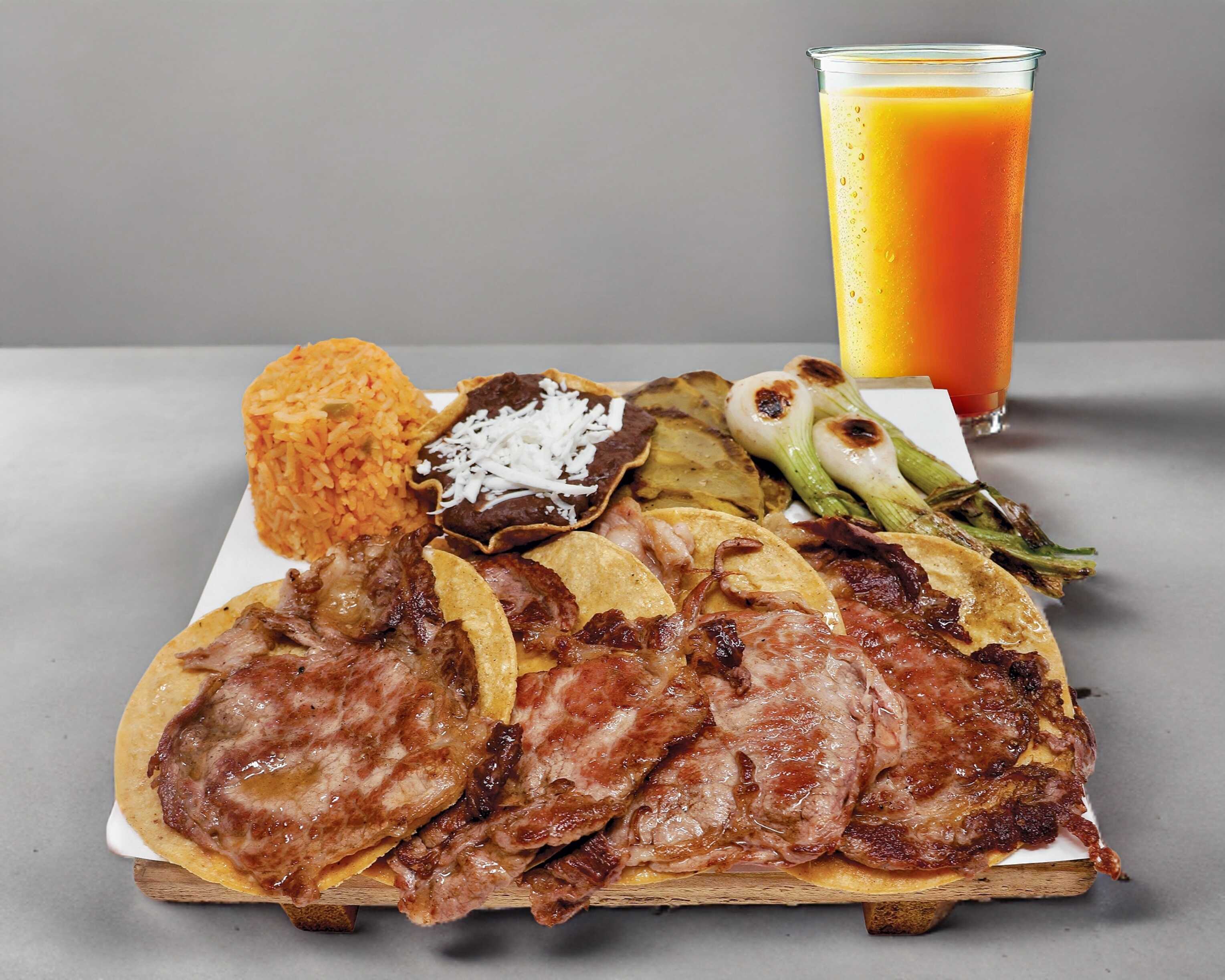4 tacos de Rib-Eye corte delgado. Acompañados de cebollas y nopales asados, frijoles y arroz. Incluye Agua del día.
